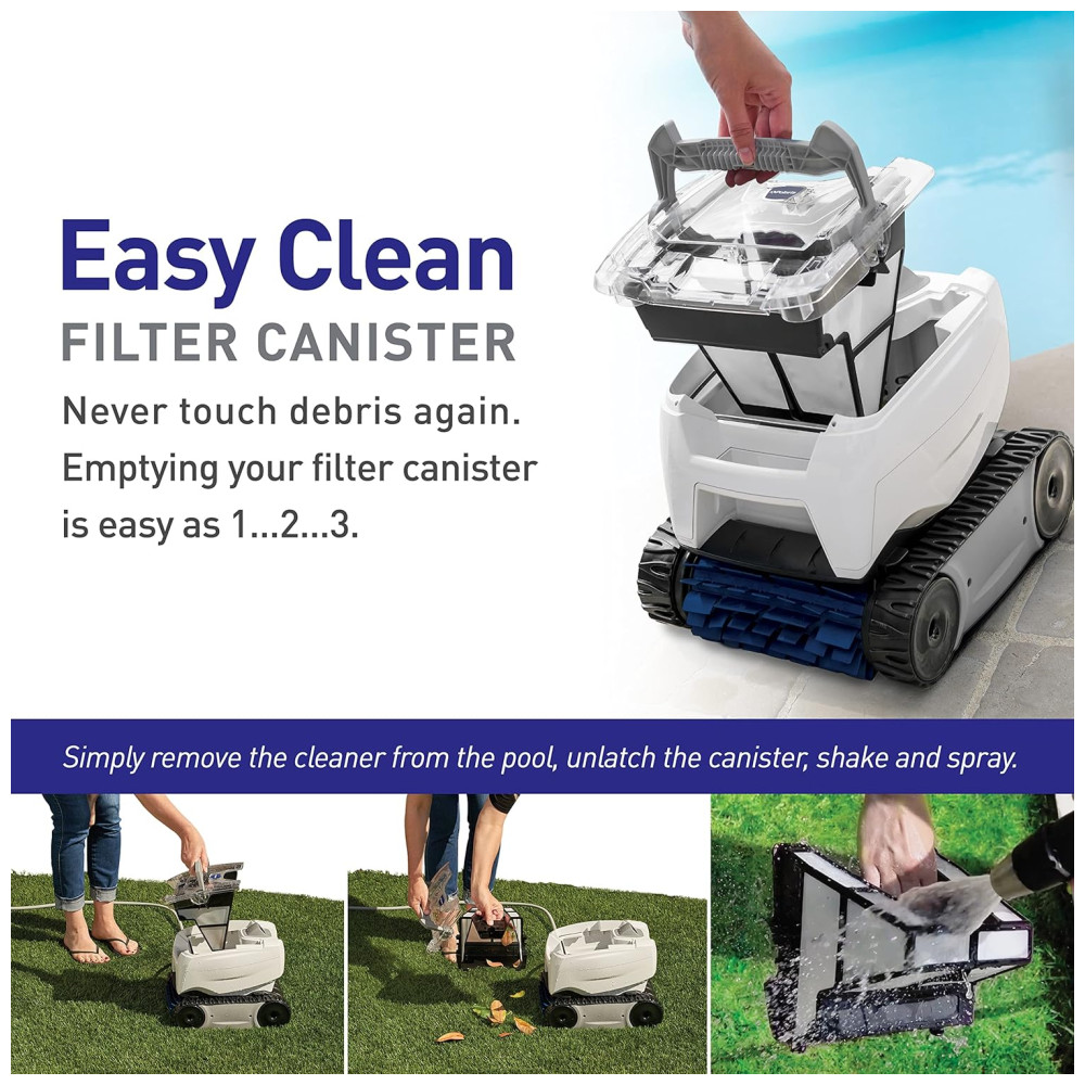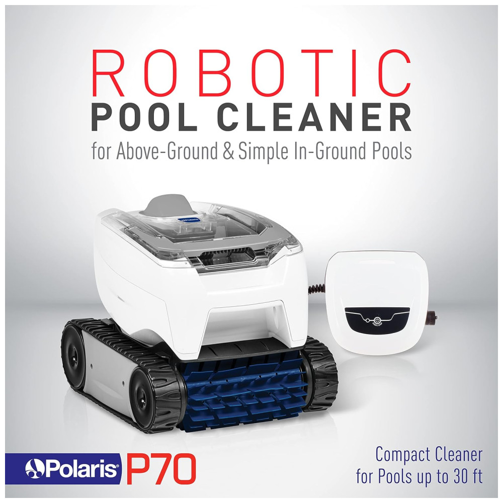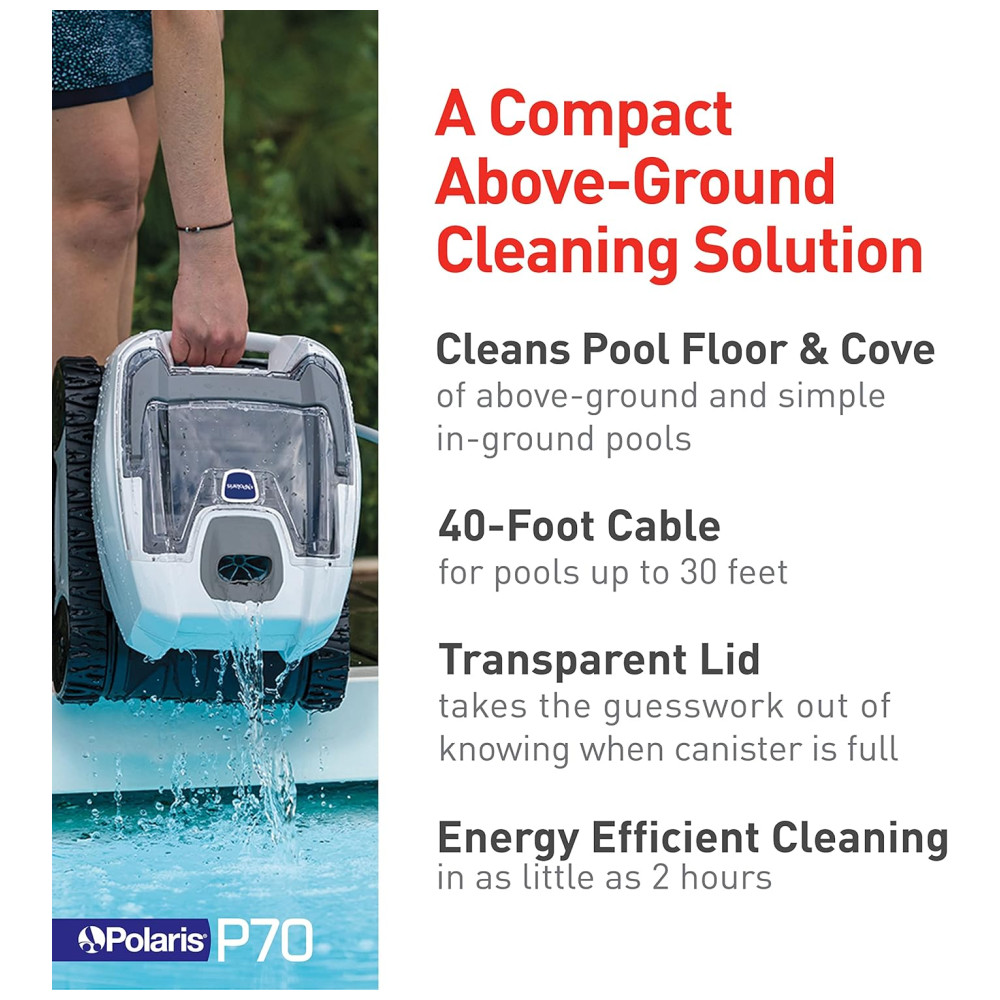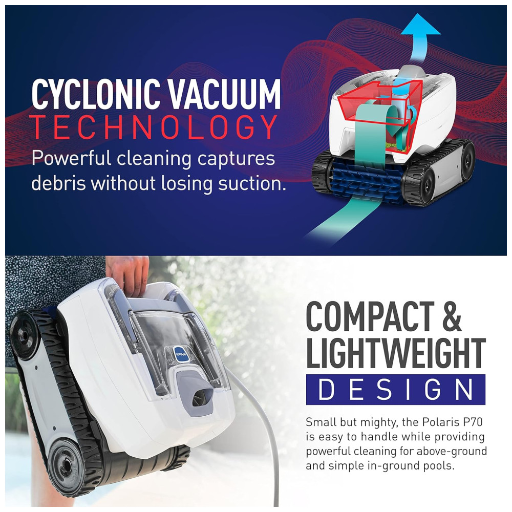 O Limpador robótico de piscinas acima do solo Polaris P70 F70 é uma excelente opção para limpar o chão e a enseada da piscina. Este produto é capaz de limpar completamente o fundo e a enseada de piscinas acima do solo e simples subterrâneas, além de esfregar essas áreas. O aspirador ciclônico permite a captura de sujeira e detritos sem perder a sucção, enquanto o recipiente de filtro de limpeza fácil pode ser facilmente removido, destravado, agitado e borrifado com a tampa transparente, eliminando a necessidade de adivinhar quando esvaziar o recipiente.