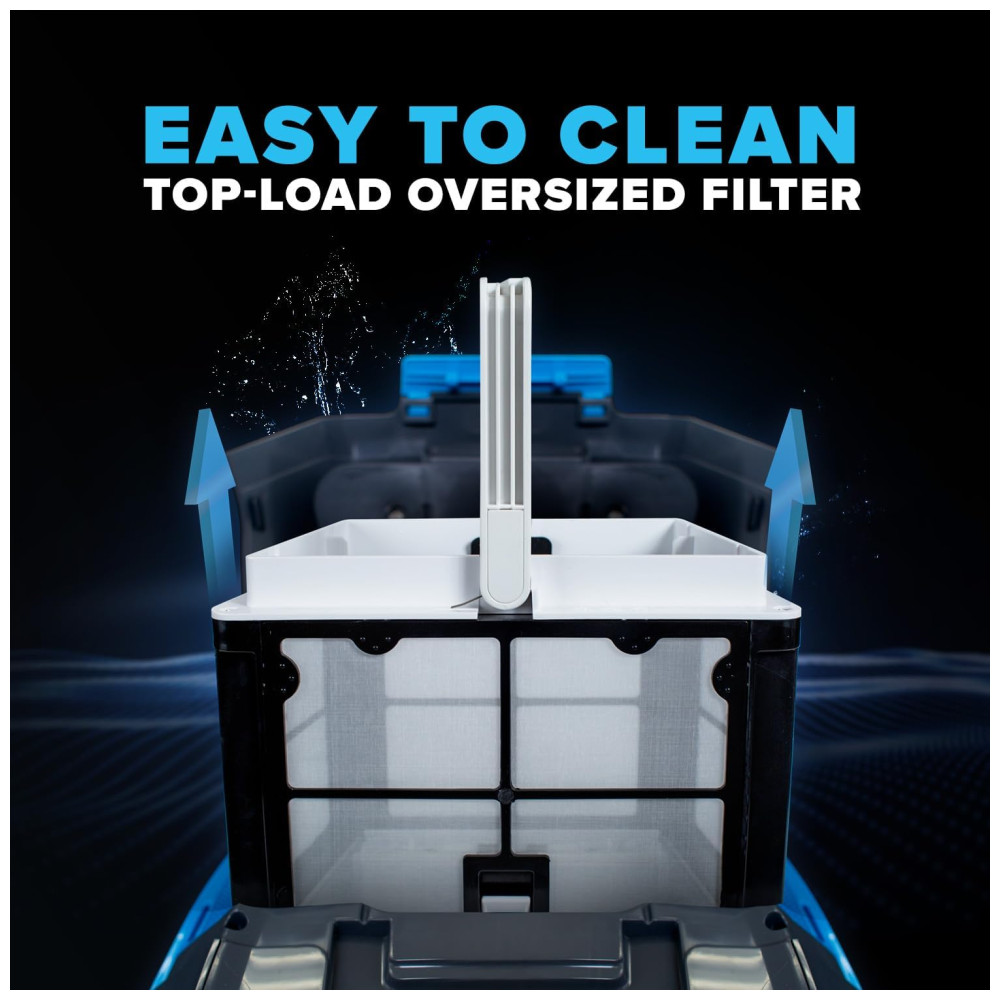 Além disso, sua escovação única e ativa remove os contaminantes mais difíceis e presos na superfície. A grande cesta de filtro de carregamento superior retém e prende folhas e detritos grandes, deixando sua piscina totalmente limpa em apenas 2 horas. Com o Cayman, não são necessárias mangueiras ou bomba de reforço, tornando o 8 vezes mais eficiente em termos energéticos do que as lavadoras de sucção e pressão, economizando energia em cada limpeza de piscina.