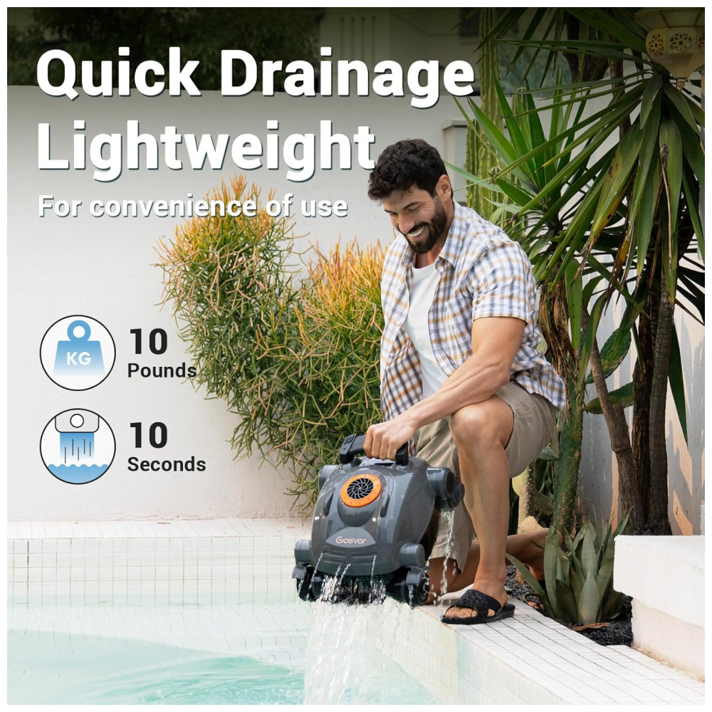 Leve e Fácil de Usar: O aspirador robô sem fio Gosvor Pivot foi projetado com a conveniência do usuário em mente. Leve e com drenagem rápida, é fácil de retirar da água e transportar. Além disso, conta com um botão de controle intuitivo, simplificando a operação – basta colocar e esquecer.