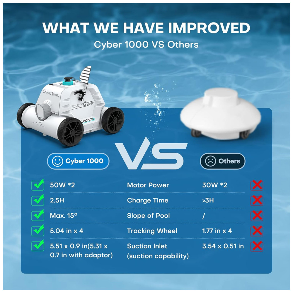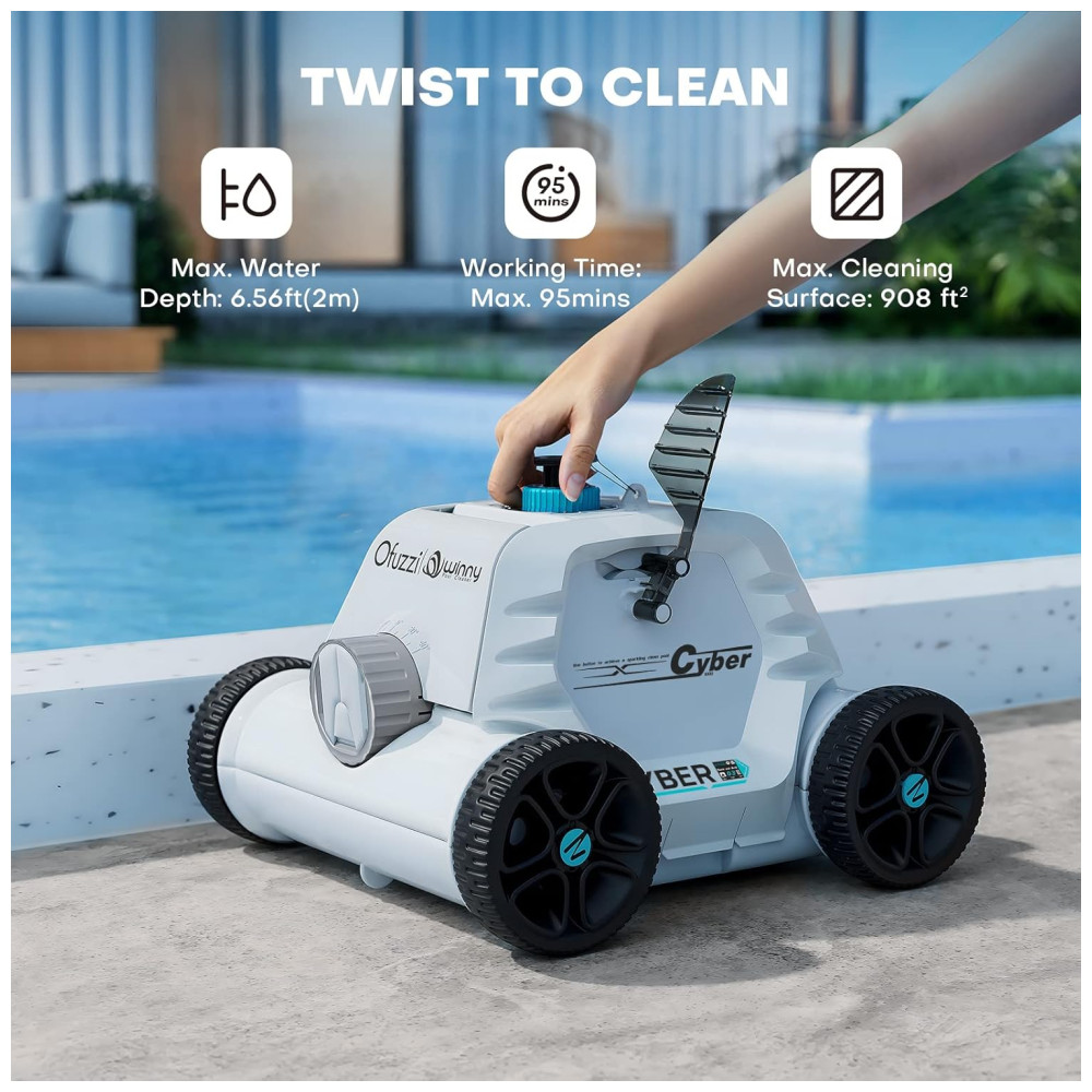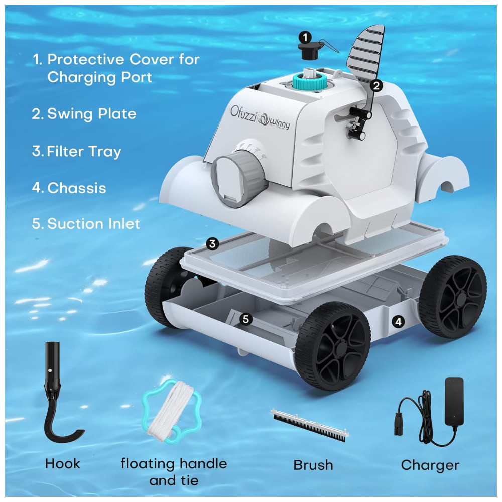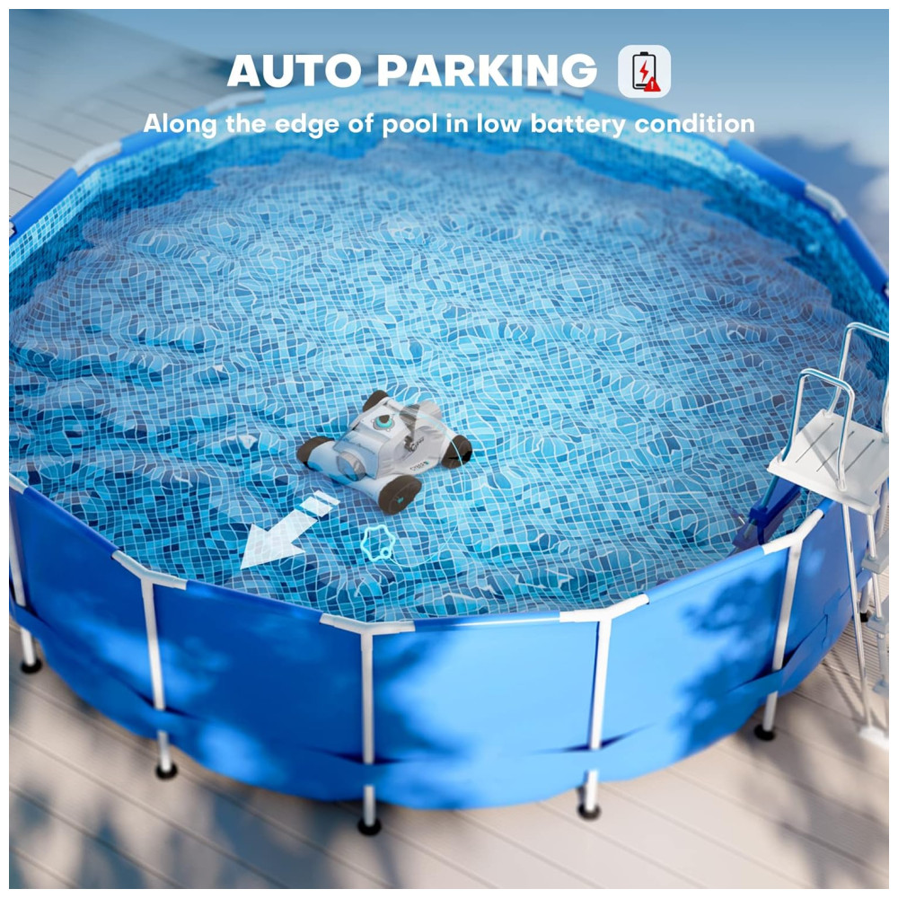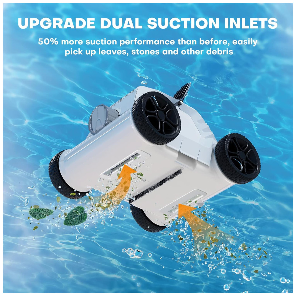 Este limpador de piscina sem fio é equipado com uma grande entrada de sucção dupla atualizada de 140 mm e um motor dualdrive de 50 W, o que lhe confere 1,5 vezes mais potência de sucção. Com isso, ele pode limpar detritos como folhas, areia, pedras, galhos e cabelos do fundo da piscina. Além disso, possui quatro rodas grandes de rastreamento de 128 mm, o que permite que ele se mova facilmente em pisos irregulares da piscina e limpe o lixo no fundo da piscina com inclinações inferiores a 15 graus.