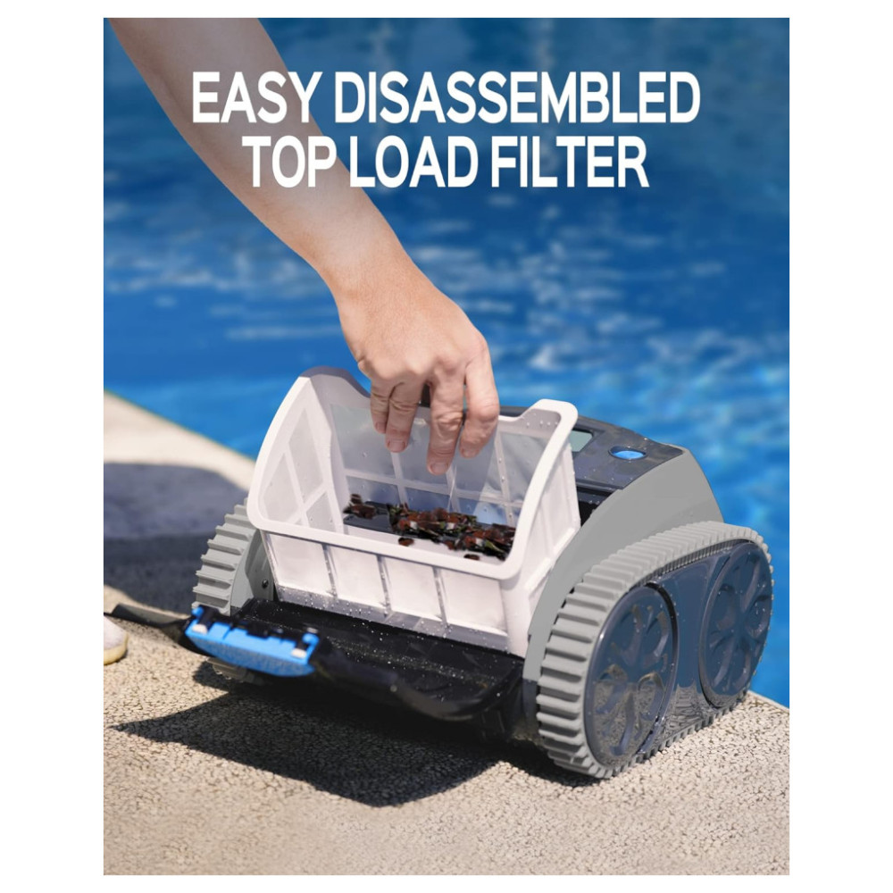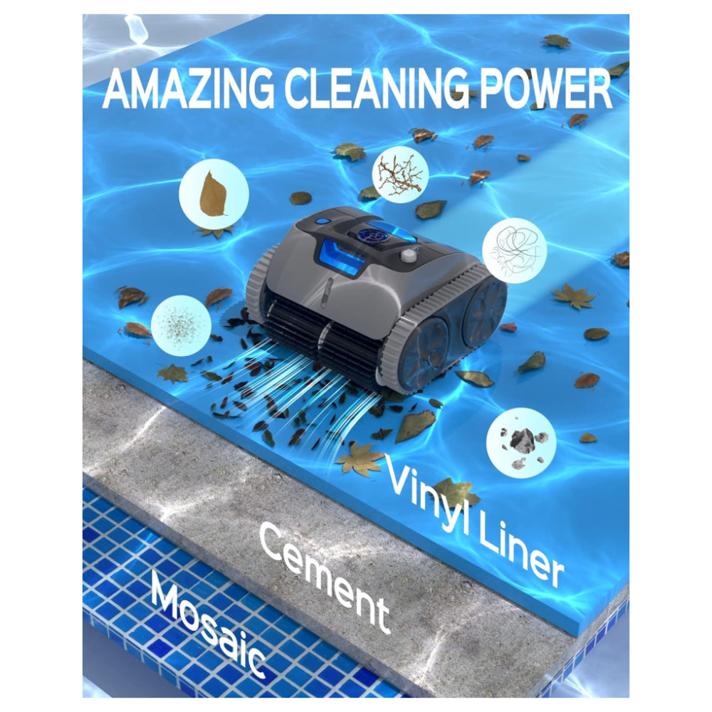 Equipado com um poderoso motor sem escova de três eixos e uma sucção poderosa de 2642 GPH, este limpador de piscina coleta com eficiência areia, sujeira, folhas, galhos, poeira e detritos. Sua excelente tração integrada e potência aprimorada permitem fácil movimento multidirecional, tornando o capaz de enfrentar qualquer superfície de piscina.