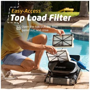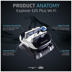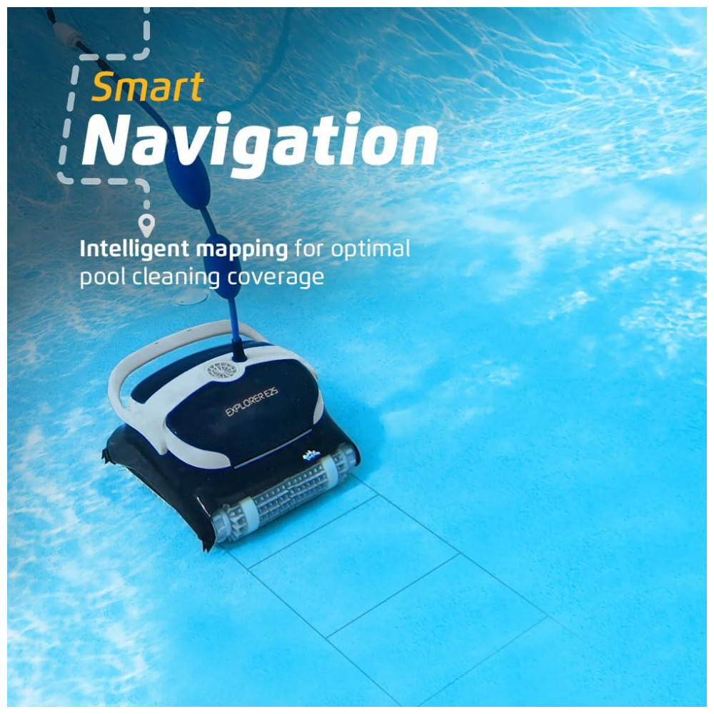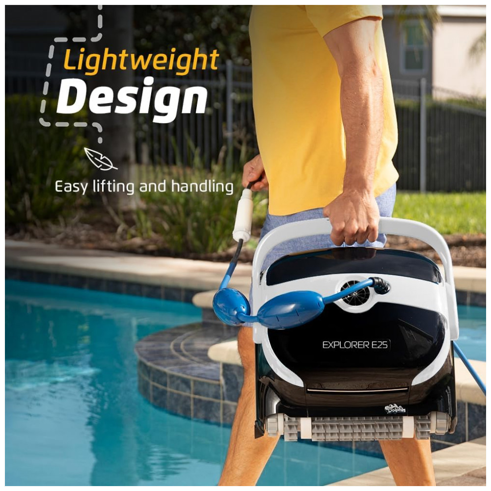 O robô aspirador Dolphin Explorer E25 é indicado para piscinas enterradas e elevadas de até 15 metros, com sistema completo de limpeza de fundo, paredes e linha d’água. Equipado com dupla escova combinada, oferece sucção de até 4.500 galões por hora (aproximadamente 17 m³/h) para remoção eficiente de detritos variados. Conta com cesto de filtro com acesso superior do tipo Easy-Clean, facilitando a remoção de resíduos sem contato direto. Conectividade Wi-Fi permite agendamento e controle remoto pelo aplicativo MyDolphin Plus para maior conveniência. Seu cabo flutuante de 15 metros evita emaranhados e permite manobrabilidade confortável. O ciclo padrão de limpeza dura aproximadamente 2 horas, com sistema de escaneamento CleverClean para cobertura total da piscina, adaptando a geometria da piscina para limpeza otimizada.