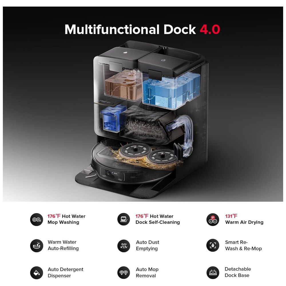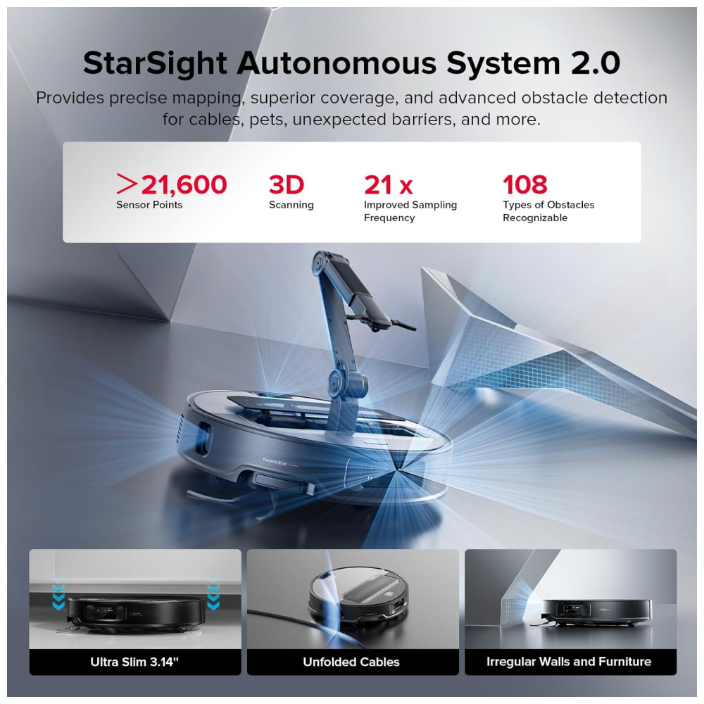 Componentes Inclusos: Robô Aspirador (1), Dock Multifuncional (1), Base do Dock (1), Bolsa de Poeira Descartável (1), Cabo de Alimentação (1), Módulo de Esfregão Rotativo (2), Manual do Usuário (1), Caixa de Armazenamento (1),