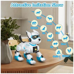 Tipo de brinquedo/robô: Robô cachorro programável com controle remoto, comando de voz, gravação de voz da criança, imitação de sons de animais, luzes LED e movimentos variados
