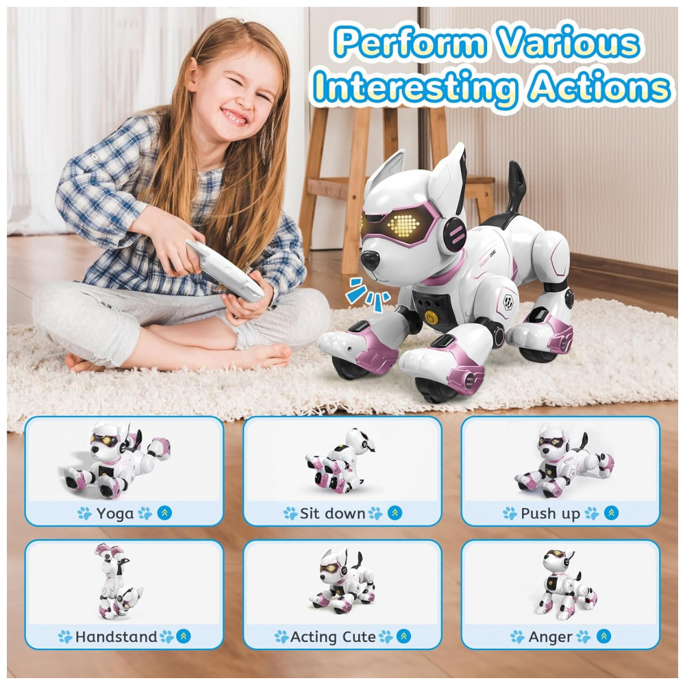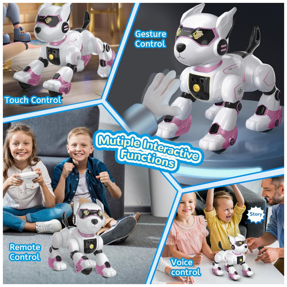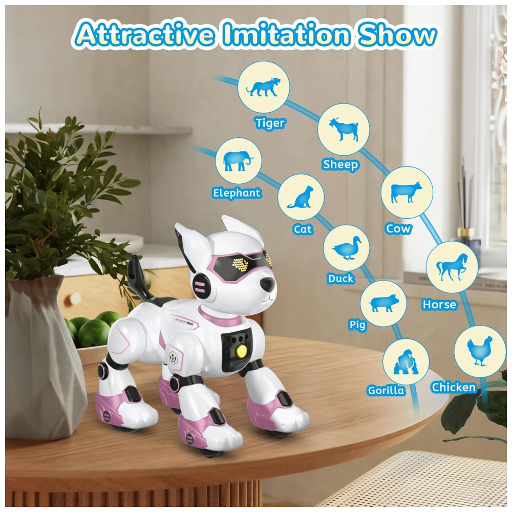 Tipo de brinquedo/robô: Robô cachorro programável com controle remoto, comando de voz, gravação de voz, imitação de sons de animais, luzes LED e movimentos variados