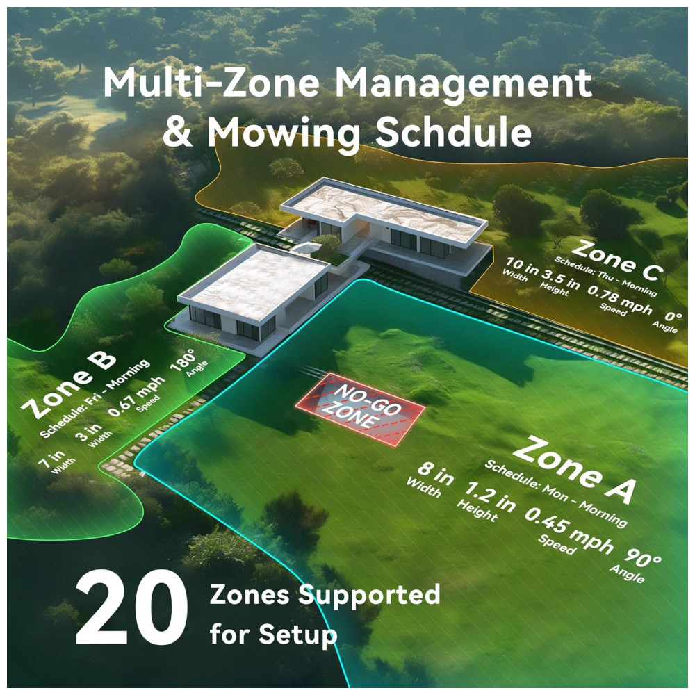 Suporta mapeamento de bordas em áreas de até 4000 m² com precisão centimétrica, permitindo configuração de múltiplas zonas de trabalho via app, incluindo áreas proibidas como piscinas ou canteiros. O sistema de evasão de obstáculos base 360° laser e fusão visual detecta objetos de 15 cm de altura e 1 cm de largura, com erro de posicionamento inferior a 2 cm e cobertura de 95%.