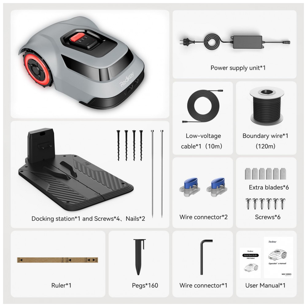 Robô Cortador de Grama Redkey MGC1000 Cinza com Fio Perimetral 180m para 1000m² Inclinação 45% 70min Autonomia Recarga Automática Posicionamento Preciso e Detecção de Interrupção
