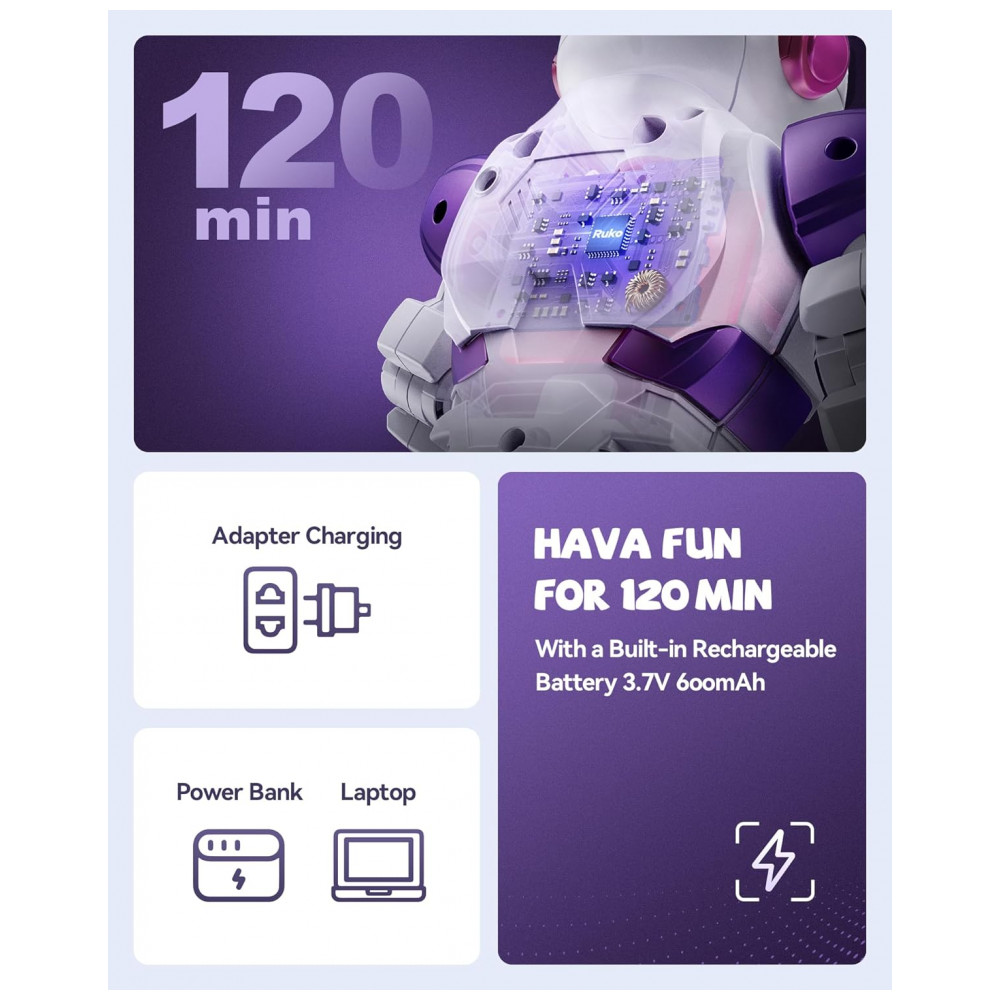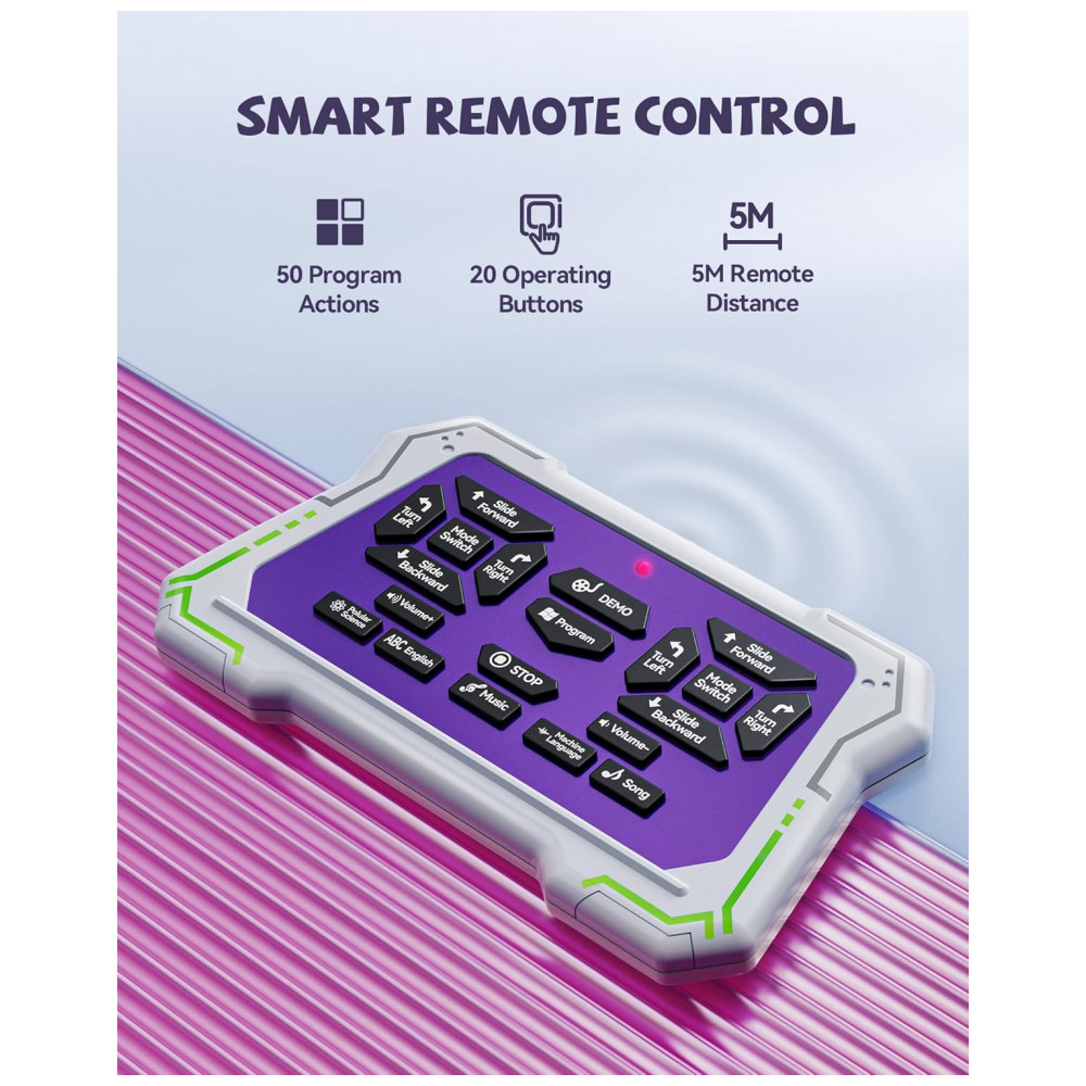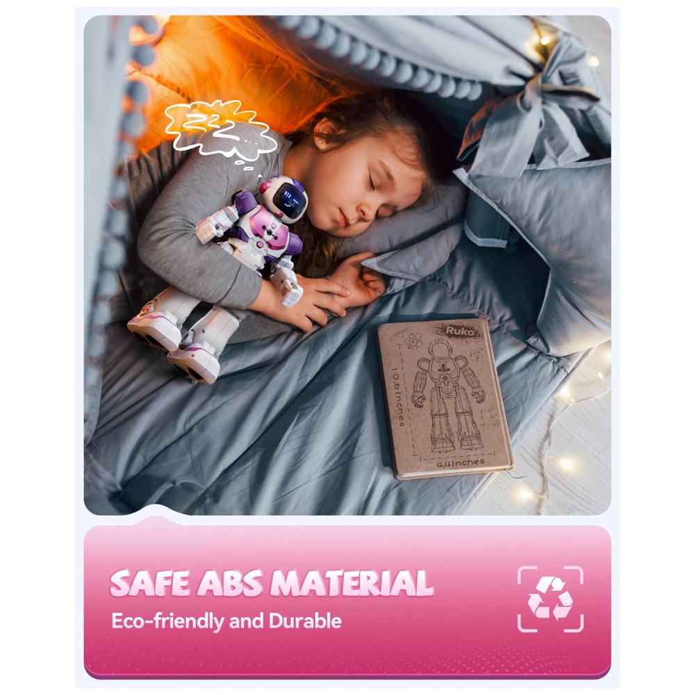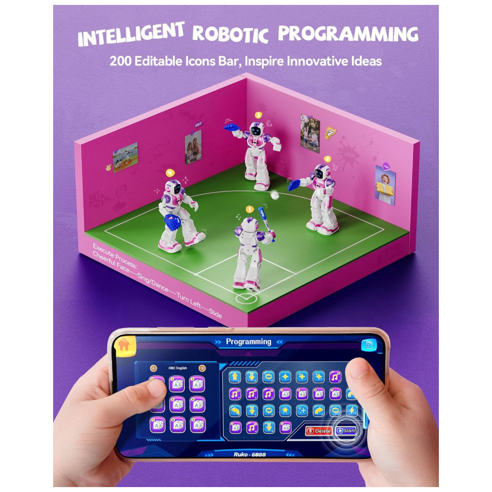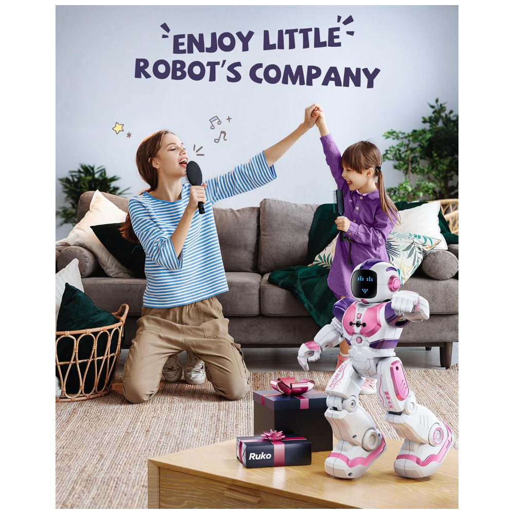 O robô dançante Ruko 6088 rosa e roxo é um brinquedo eletrônico interativo indicado para crianças de 3 a 6 anos, com corpo em plástico ABS, acabamento liso e bordas arredondadas para manuseio infantil. Ele permite controle por gestos, controle remoto e aplicativo, possibilitando comandar movimentos de avanço, recuo, curvas, caminhada e deslizamento, além de executar rotinas de canto e dança com animações em LED no “rosto” do robô.