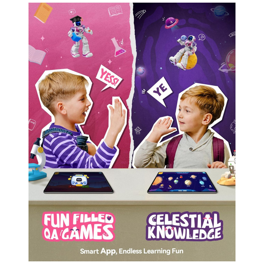Funções adicionais: Programação de até 50 movimentos, expressões em LED, jogos de perguntas e respostas no aplicativo, ajuste de volume em múltiplos níveis
