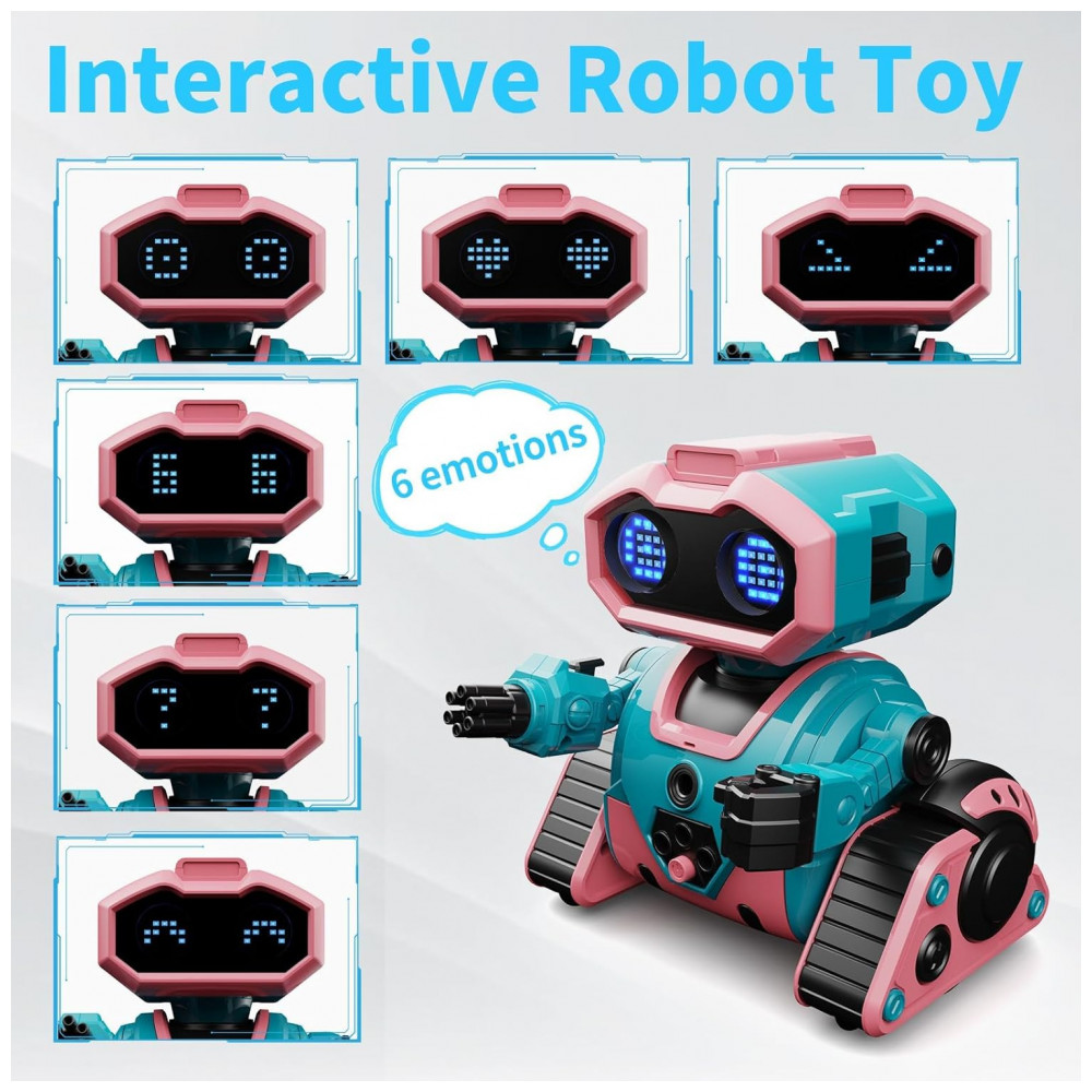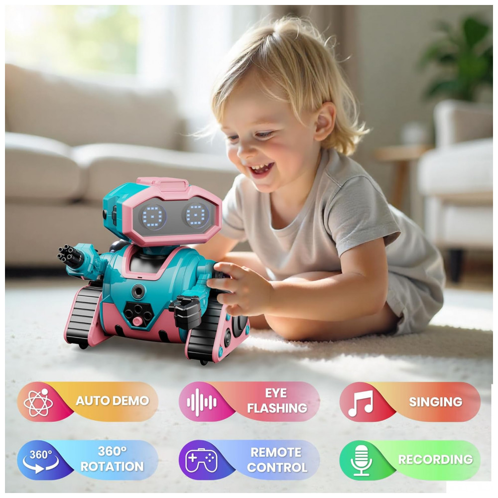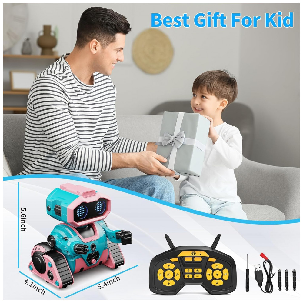 O robô DWIRCTOYS K103 é um brinquedo eletrônico recarregável com controle remoto, projetado para crianças a partir de 3 anos, que combina movimentos motorizados, luzes em LED e efeitos sonoros. O modelo possui olhos em LED com 6 expressões diferentes e função de demonstração automática, na qual o robô executa uma sequência de dança com música. O volume pode ser ajustado, permitindo adequar o nível de som ao ambiente de uso.