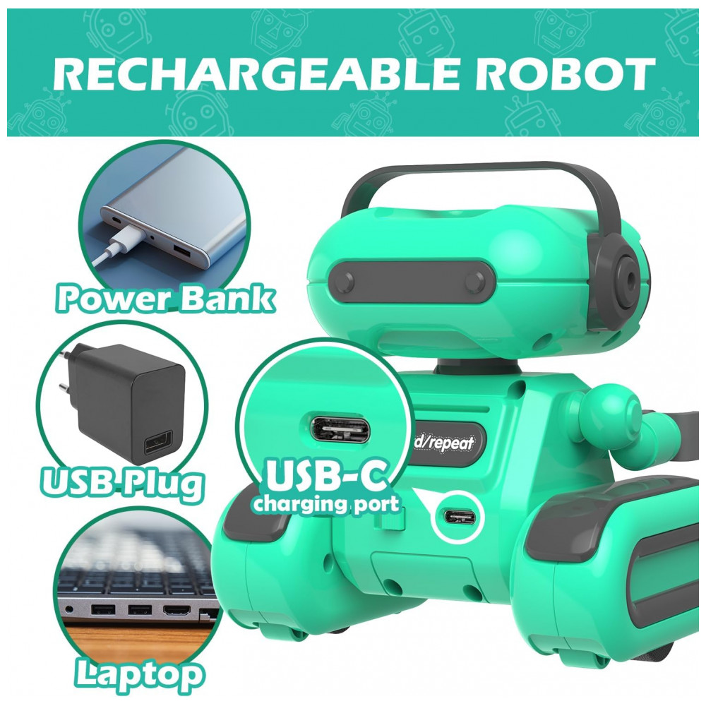 A alimentação do robô é feita por bateria interna recarregável, com recarga via cabo USB-C conectado à parte traseira da base. O controle remoto utiliza duas pilhas AAA, inseridas em compartimento com tampa fixada por parafuso. O corpo é produzido em plástico adequado para uso infantil, com superfícies lisas e dimensões compactas, facilitando o manuseio por crianças na faixa recomendada.