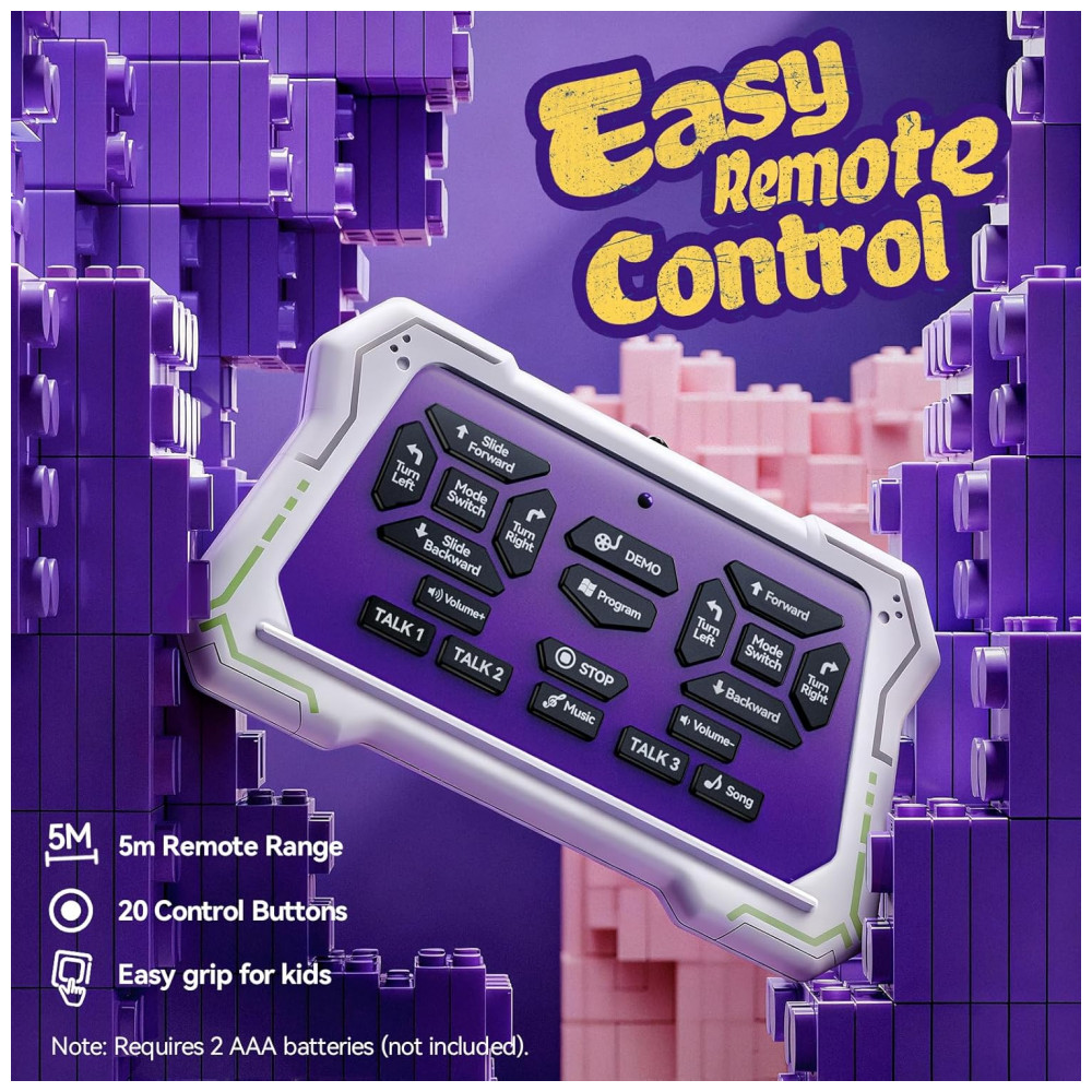 O brinquedo possibilita programar até 50 combinações de movimentos, permitindo que a criança crie rotinas de ações para o robô, explorando noções básicas de lógica e sequência. A bateria recarregável de 3,7V 600mAh oferece até 120 minutos de uso após aproximadamente 2–3 horas de carregamento via USB, e o tamanho compacto facilita o transporte e o uso em ambientes internos com piso plano.