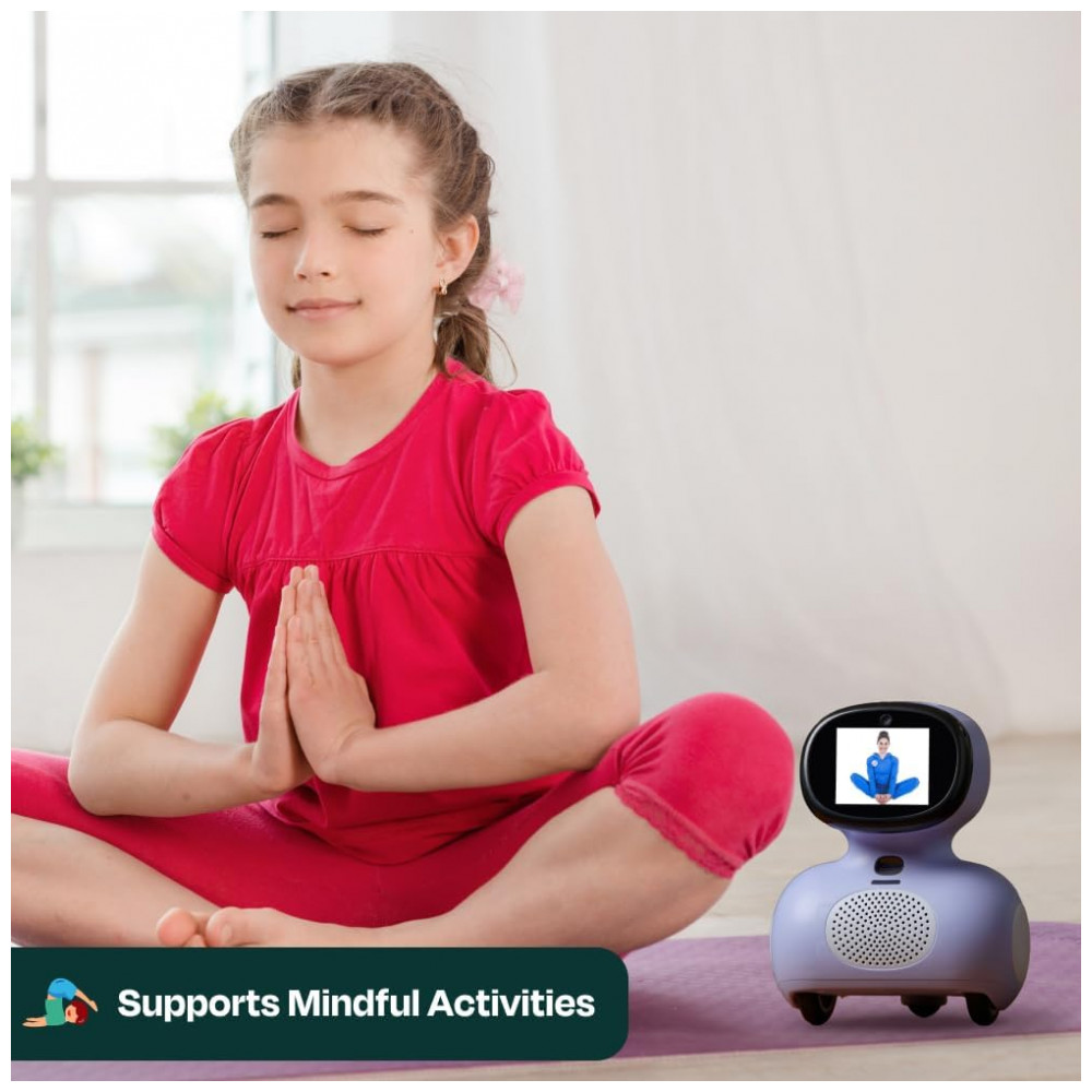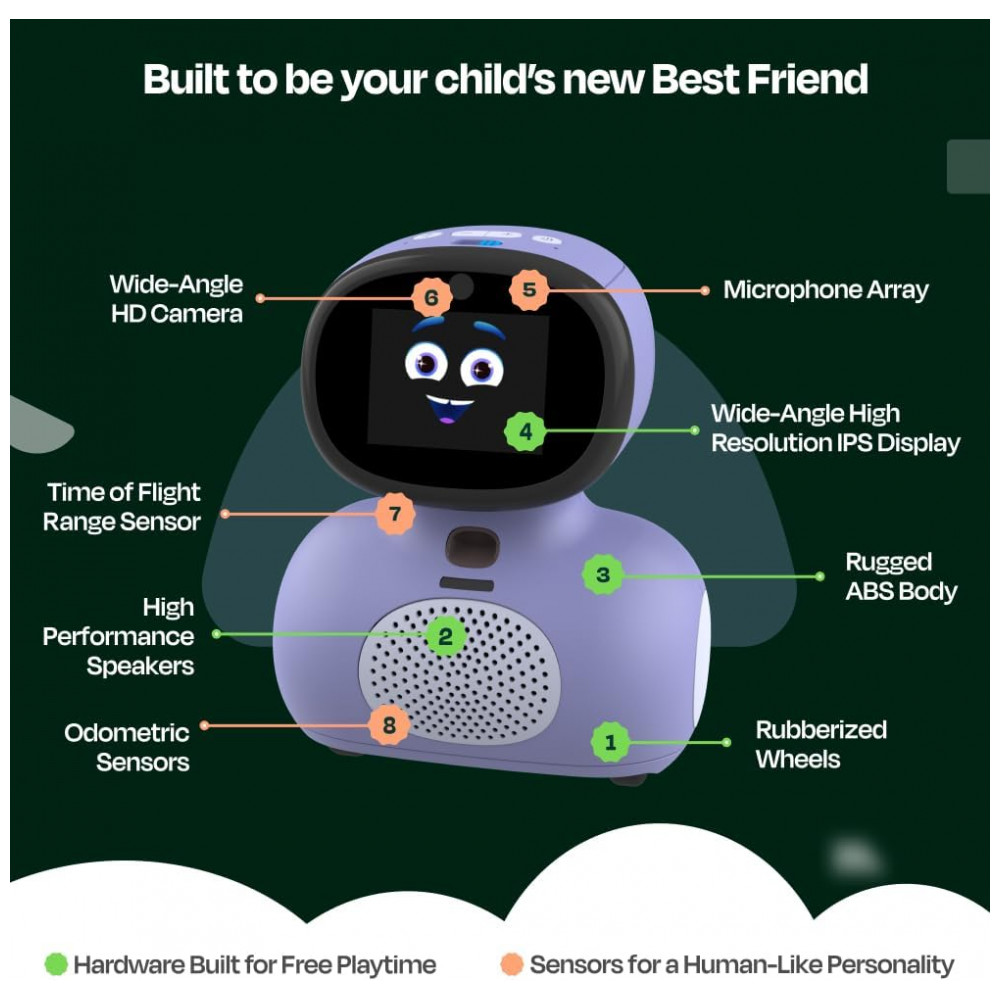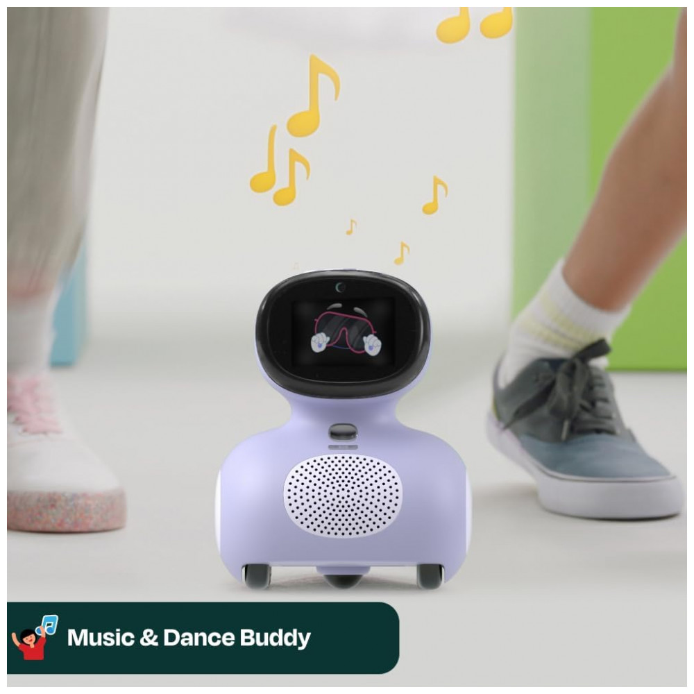 O sistema combina conteúdos STEAM com músicas, danças, piadas e desafios, usando um motor de IA para adaptar respostas e propostas de atividades conforme o uso se intensifica. A estrutura de hardware inclui corpo compacto em polipropileno, com acabamento roxo, e base estável para uso sobre mesas e bancadas. Sensores de movimento e obstáculos auxiliam na navegação em superfícies planas, enquanto luzes e sons integrados complementam o feedback durante jogos e interações.