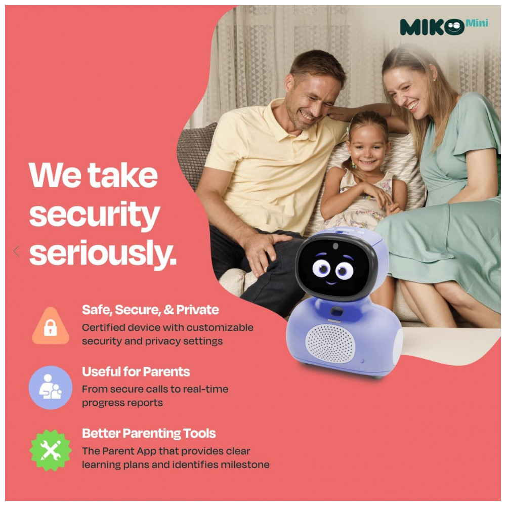 O Miko Mini foi desenvolvido com foco em segurança e uso infantil, incluindo recursos de controle por responsáveis e adequação etária de conteúdo. O formato compacto e o peso em torno de 0,96kg facilitam o transporte entre cômodos e o armazenamento quando não está em uso. O design prioriza superfícies suaves e estrutura resistente para suportar o uso recorrente dentro do ambiente doméstico.