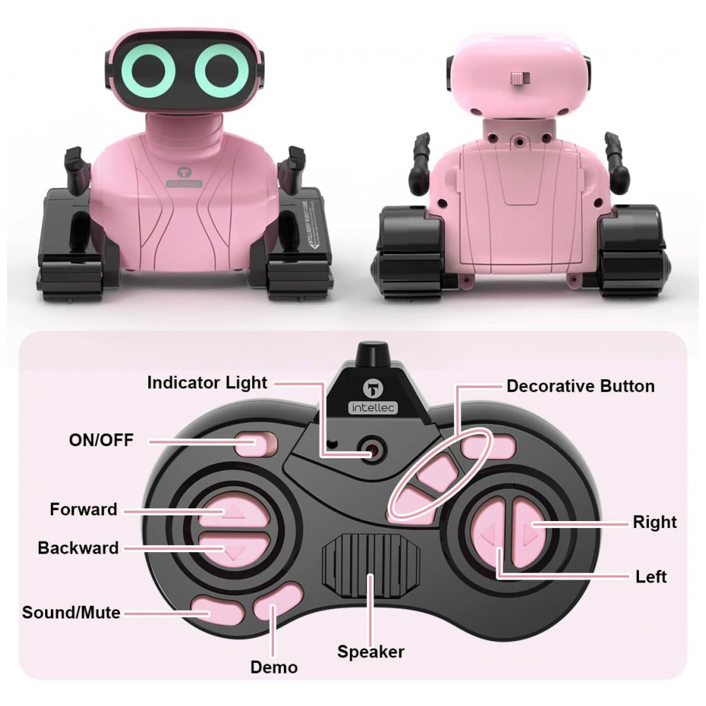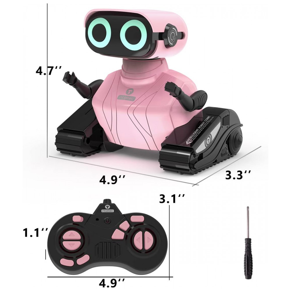 O brinquedo do robô é projetado em duas partes. A parte superior apresenta um robô bonito com olhos LED e braços flexíveis, capazes de assumir diferentes posturas. A parte inferior consiste em trilhos de tanque, que podem deslizar para a esquerda e para a direita, além de girar 360 no lugar.