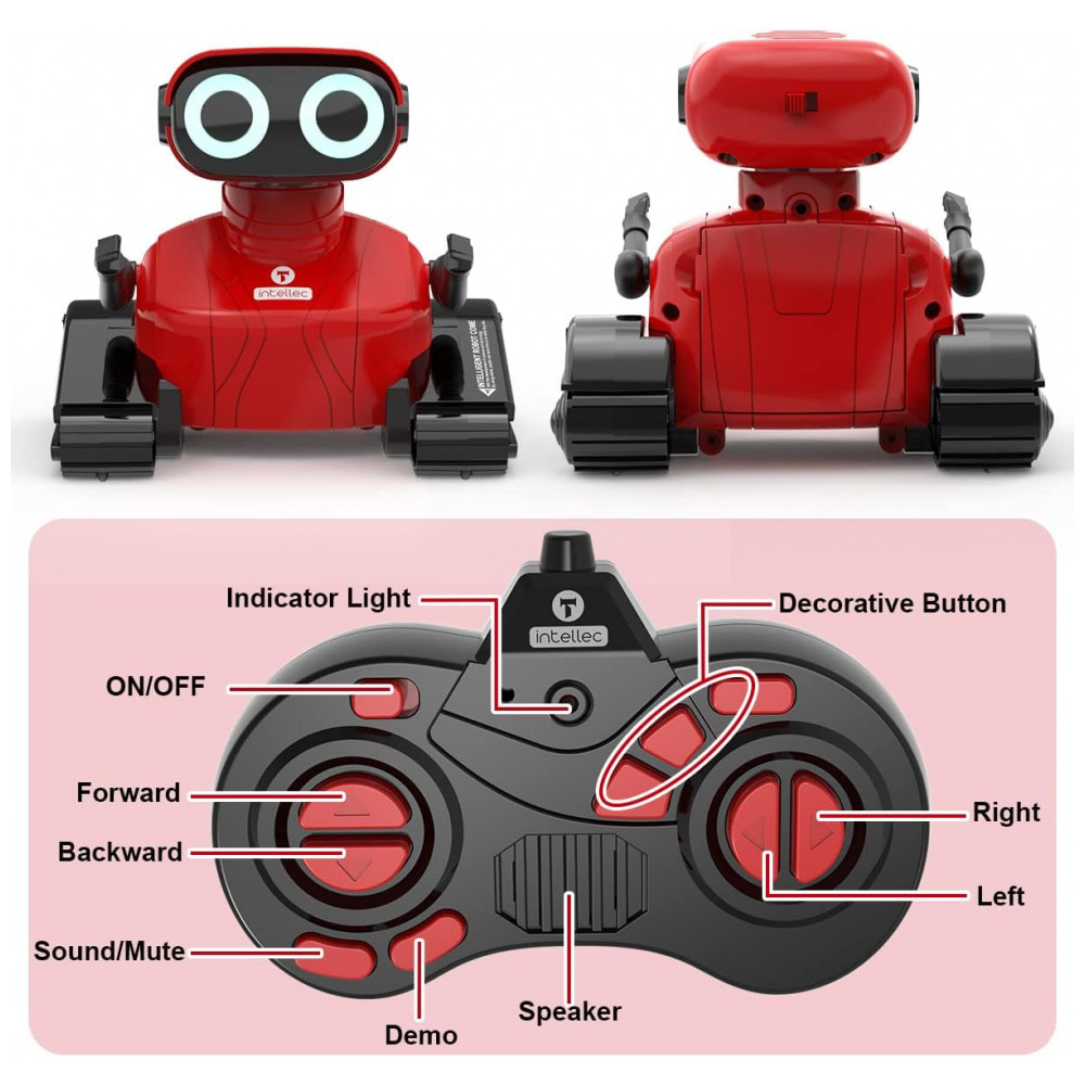 O brinquedo do robô é projetado em duas partes. A parte superior apresenta um robô bonito com olhos LED e braços flexíveis, capazes de assumir diferentes posturas. A parte inferior consiste em trilhos de tanque, que podem deslizar para a esquerda e para a direita, além de girar 360 no lugar.