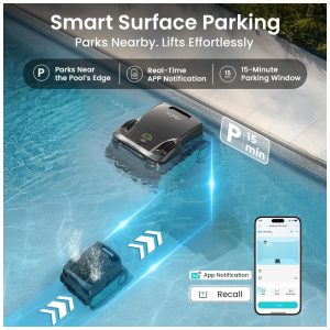 Funcionalidades abrangem modos de limpeza seletiva (fundo, paredes, superfície), autoestacionamento e filtro multicamadas removível para lavagem fácil.