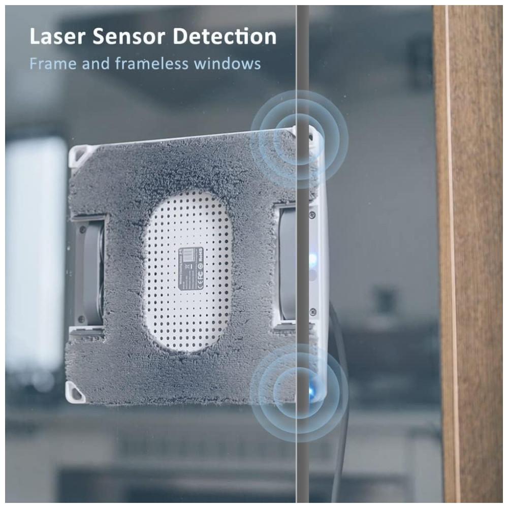 Equipado com sensores a laser para detectar superfícies de estrutura e sem moldura, uma bateria de segurança que retém o robô por 20 a 30 minutos em caso de falta de energia, e uma corda de segurança sem emaranhamento para limpeza em janelas altas.