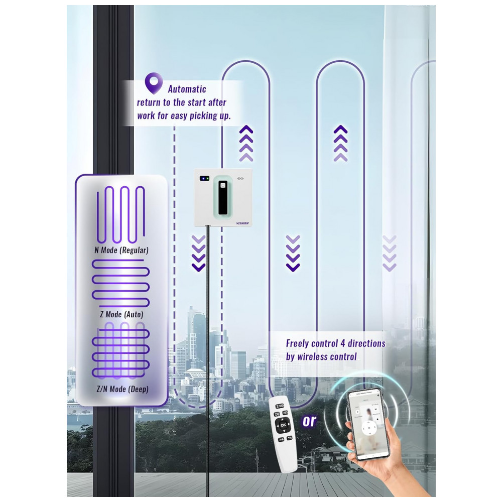 Oferece três modos automáticos: Caminhos Z, N, Z e N. Simula o modo de limpeza manual de janelas, alternando spray de água esquerdo e direito, com um spray e depois um pano. Pode controlar quatro direções de avanço e dois módulos de pulverização de água atomizada livremente por meio do controle remoto e do aplicativo de telefone celular.