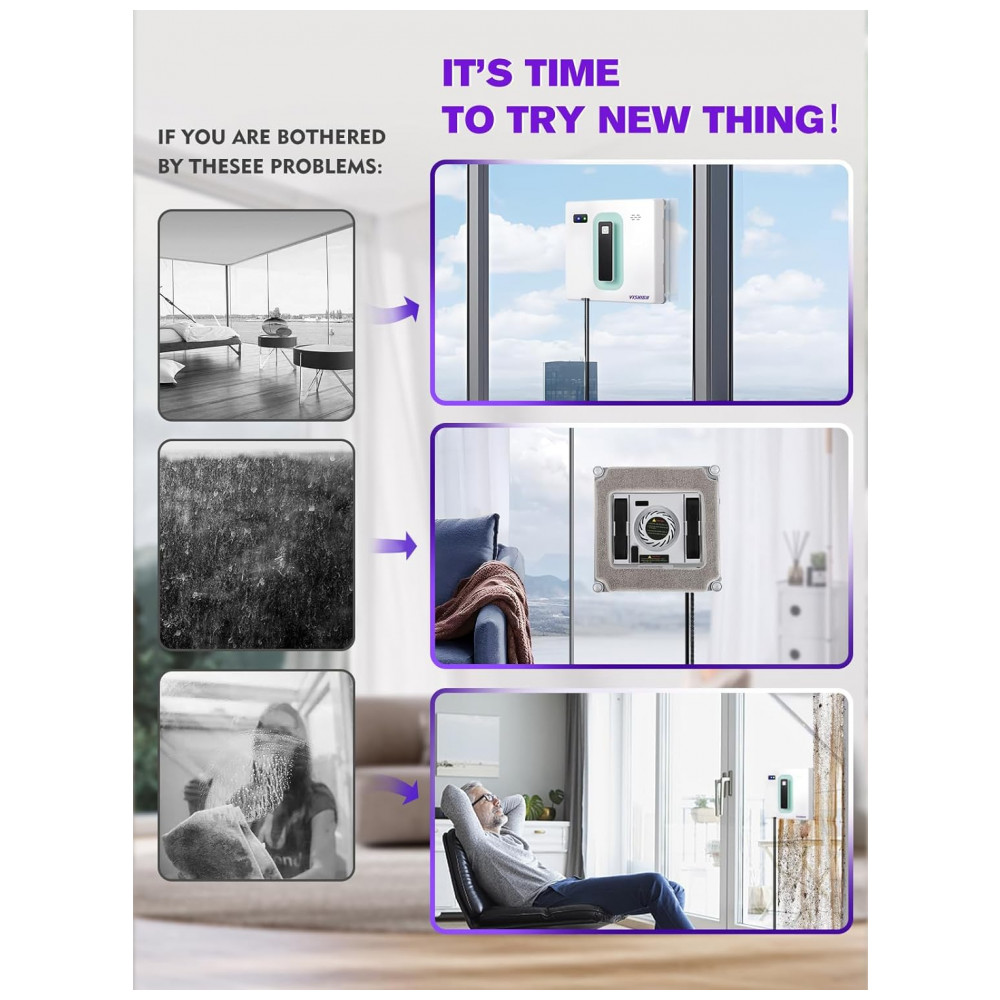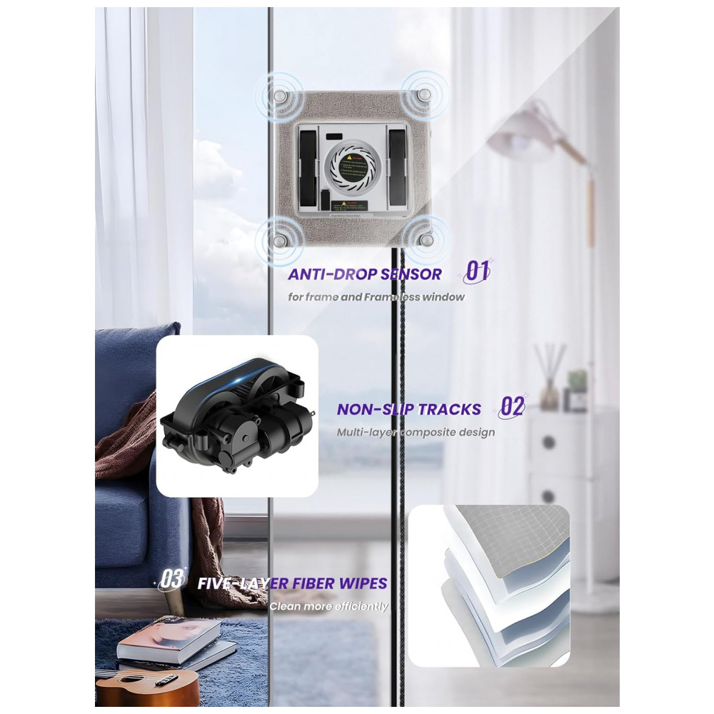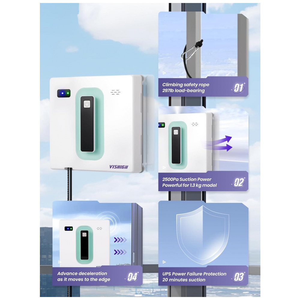 Possui um dispositivo de proteção contra falha de energia integrado UPS, mantendo a sucção por 20 minutos em caso de falha acidental de energia. Equipado com uma corda de segurança de escalada com suporte de carga de 121 kg durante o trabalho, permitindo que a corda seja enrolada em torno de um ponto estável. Os quatro cantos inferiores do tipo rolamento proporcionam movimento flexível, evitando colisões nas bordas da máquina, e os sensores internos detectam janelas com ou sem moldura, prevenindo quedas.