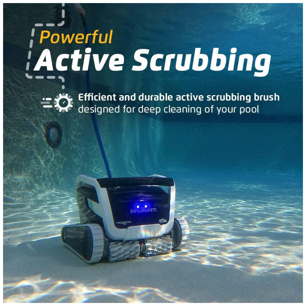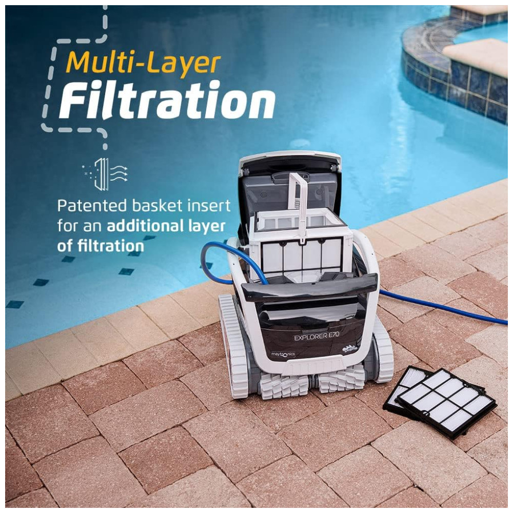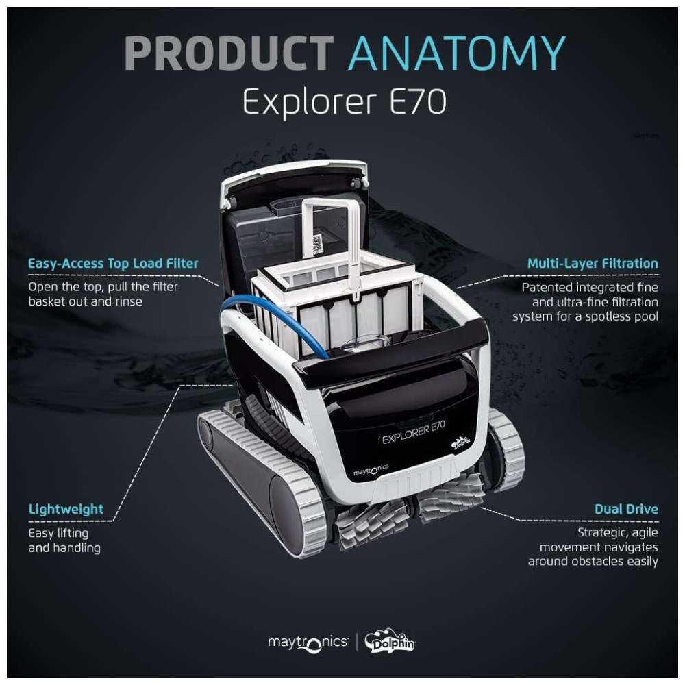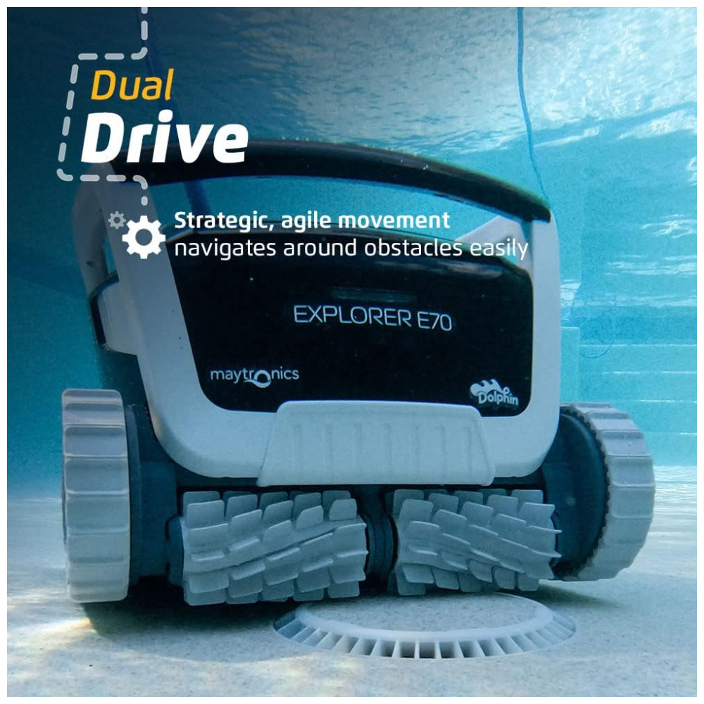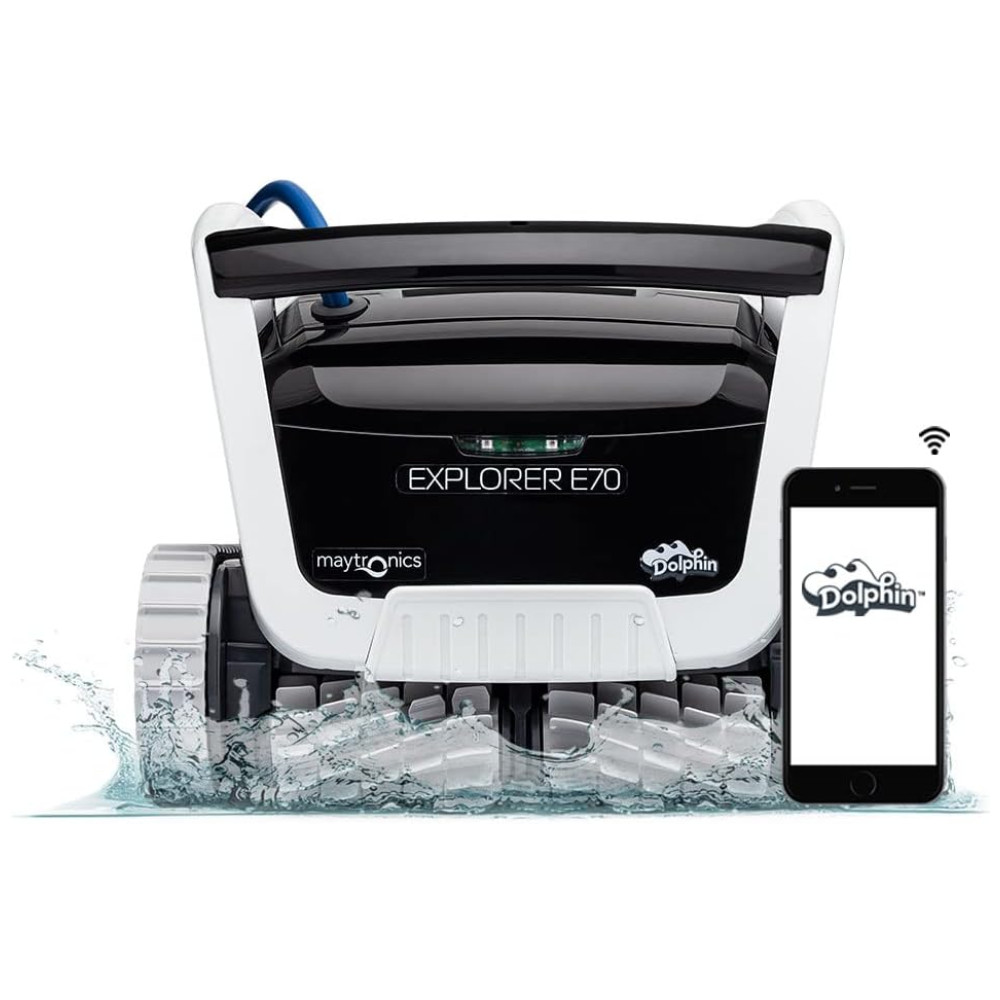 Com o aspirador robótico de piscina Dolphin Explorer E70, agende as limpezas da sua piscina de qualquer lugar com Wi Fi sempre conectado. Mantenha a área da sua piscina organizada e simplifique o transporte e o zenamento com o Universal Caddy incluído.