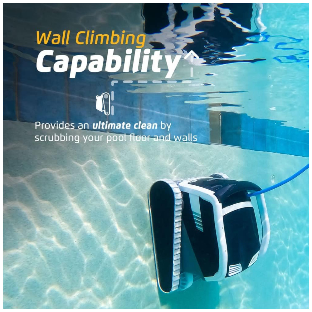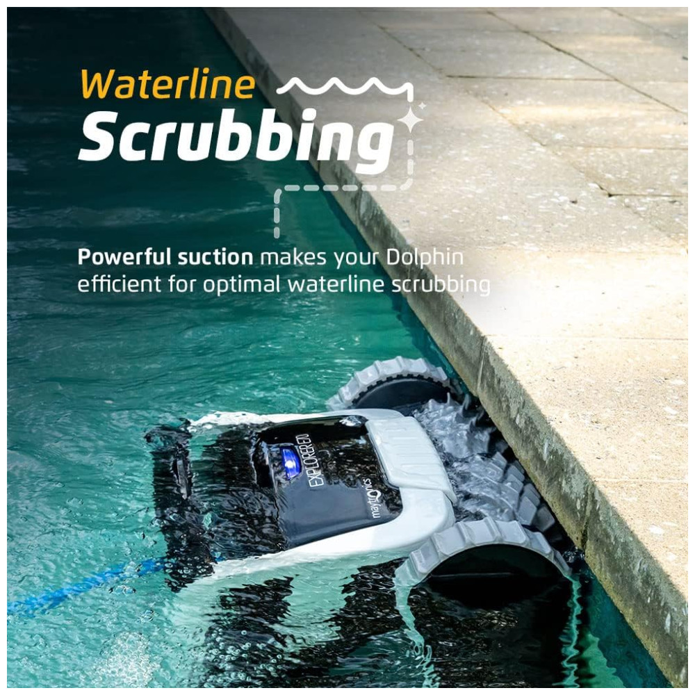 O aspirador de piscina Dolphin possui poderosos recursos de escalada em paredes para esfregar o chão, as paredes e a linha de água da sua piscina, independentemente do formato ou tipo de superfície da piscina.