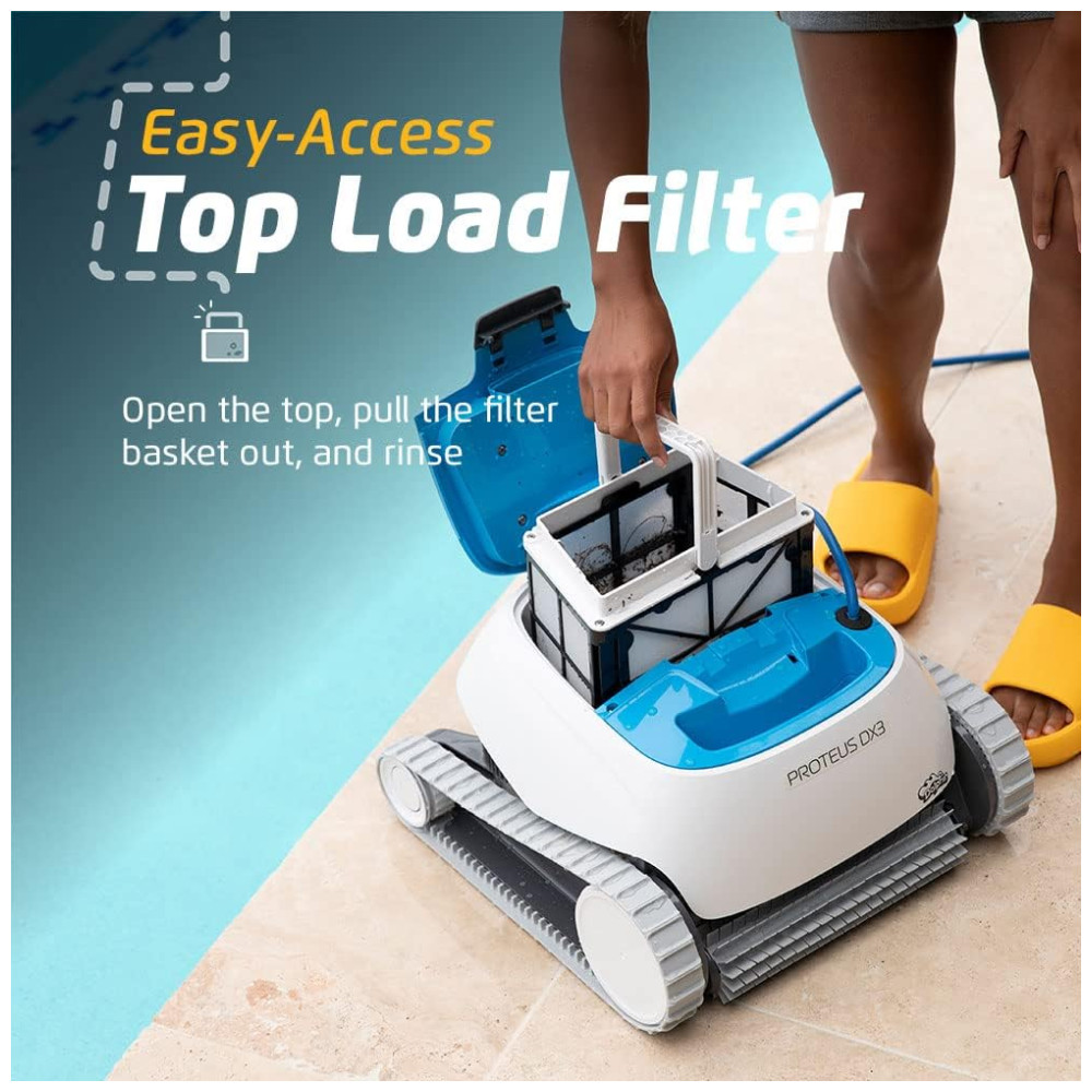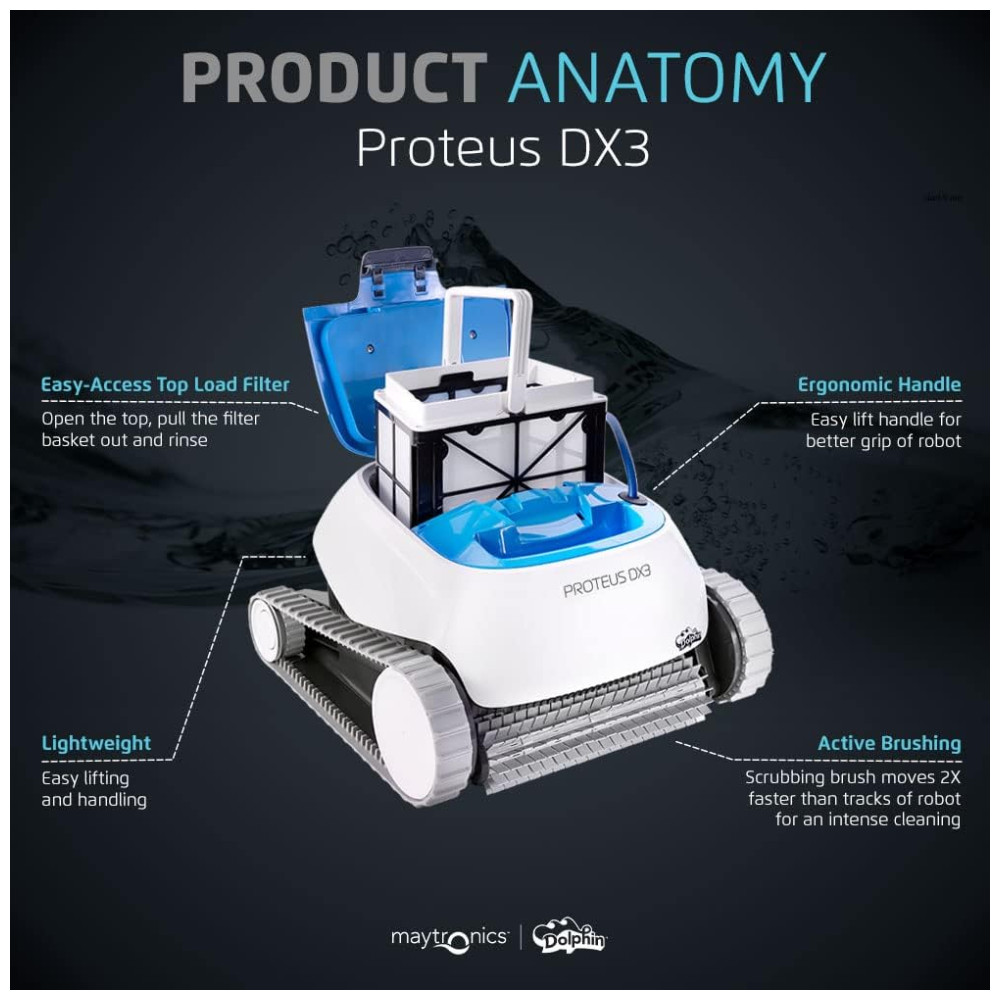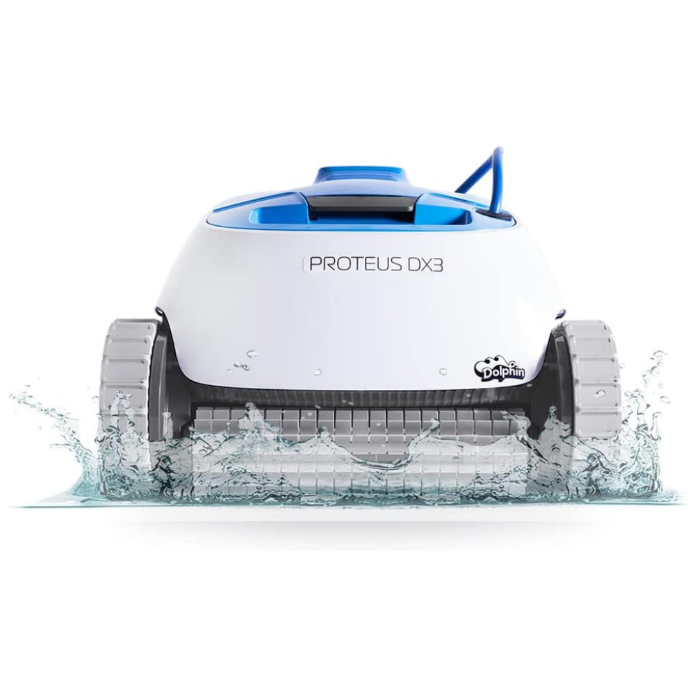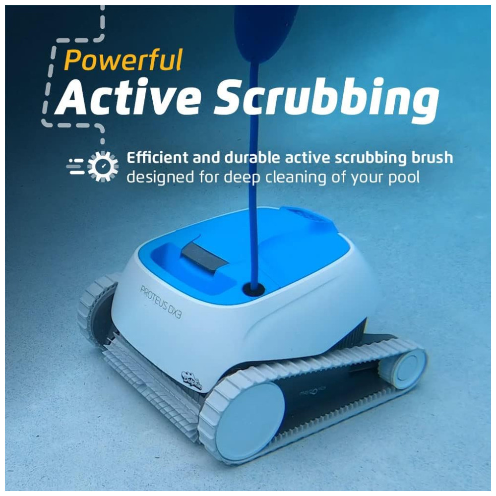 O aspirador robótico para piscina Dolphin Proteus DX3 apresenta poderosos recursos de escalada em paredes para esfregar o chão e as paredes da sua piscina, independentemente do formato ou tipo de superfície da piscina.