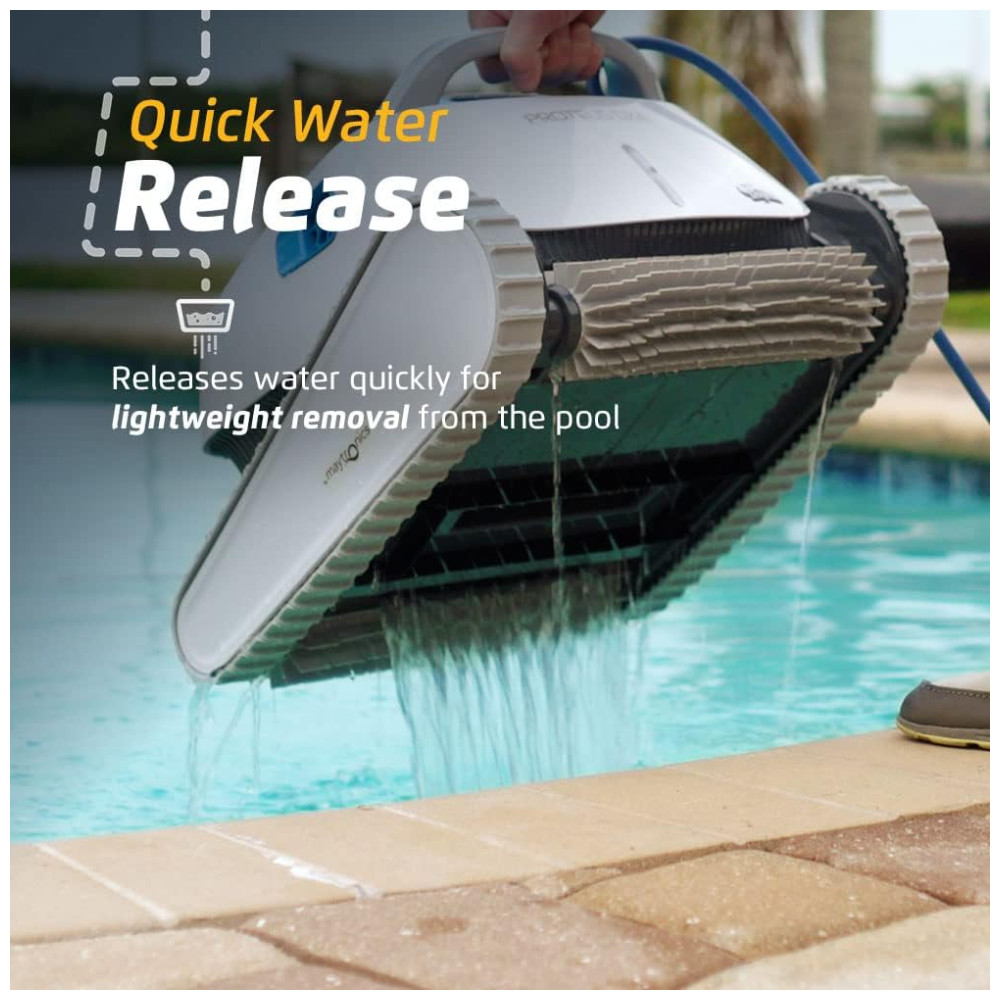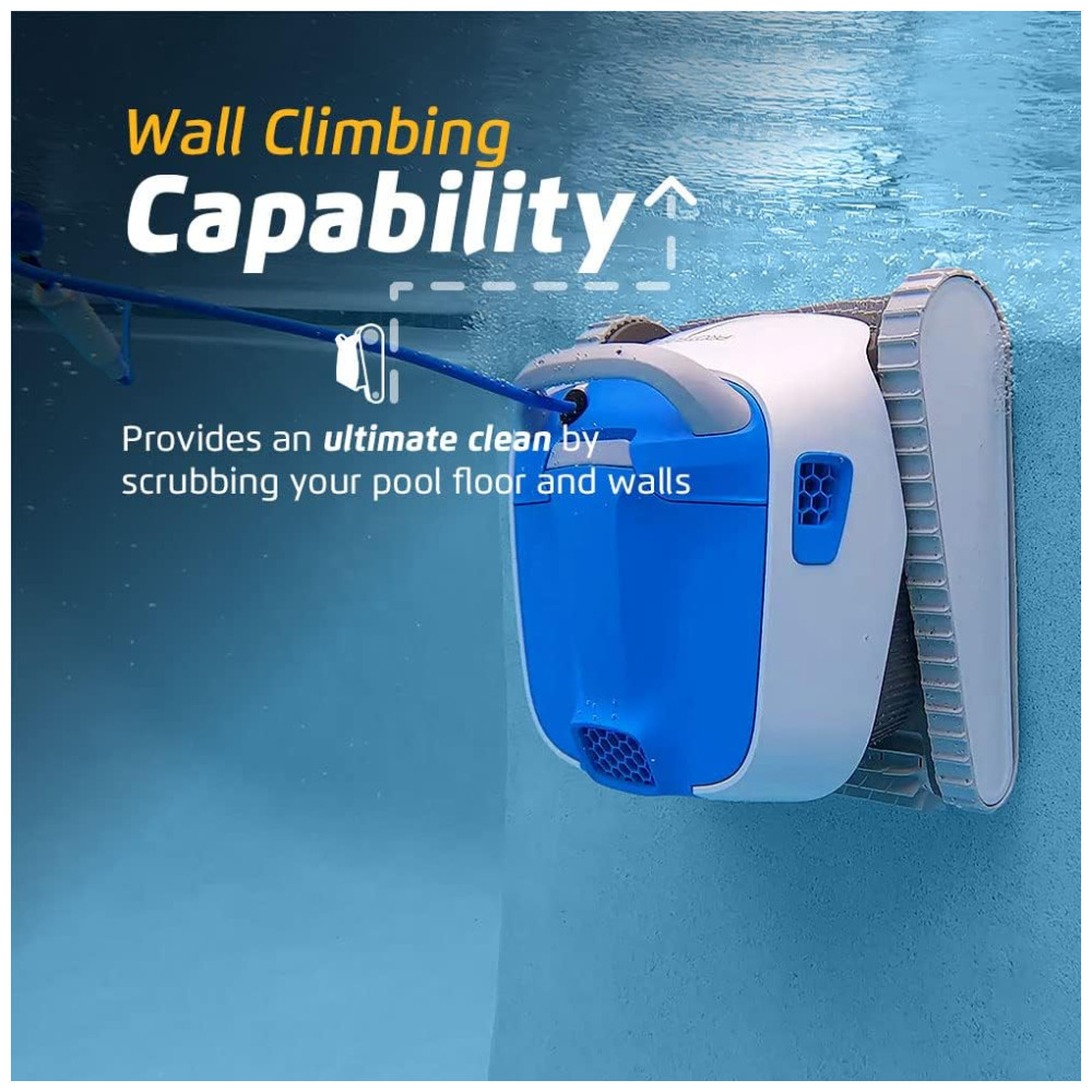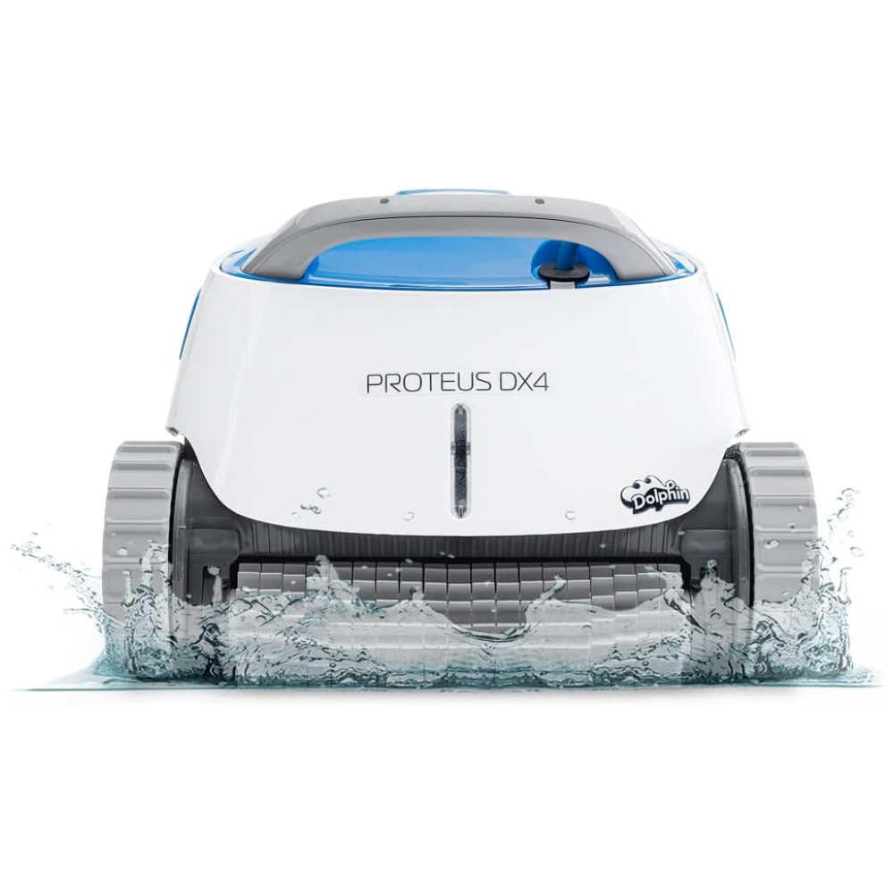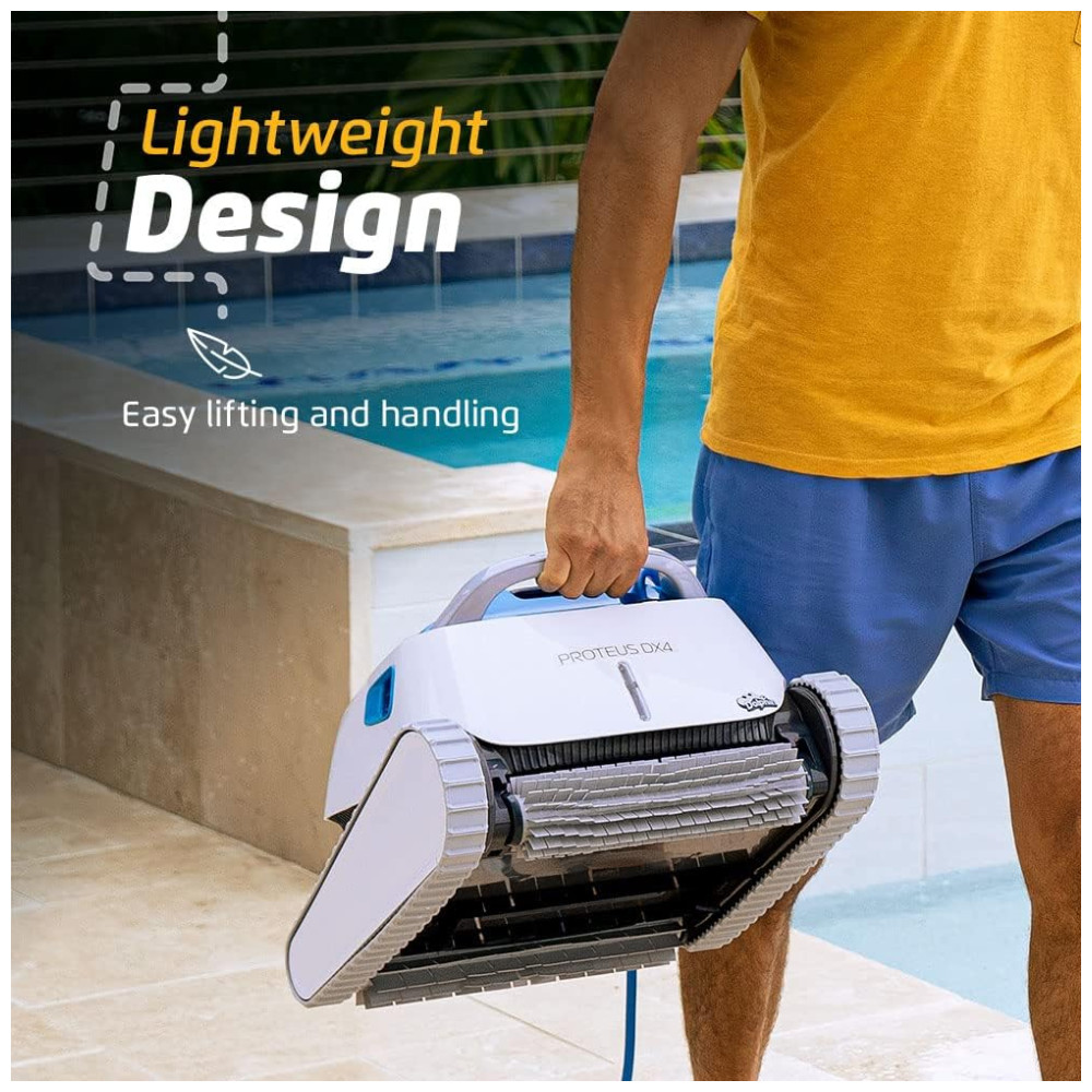 O aspirador robótico para piscina Dolphin Proteus DX4 apresenta poderosos recursos de escalada em paredes para esfregar o chão e as paredes da sua piscina, independentemente do formato ou tipo de superfície da piscina.