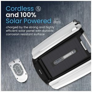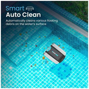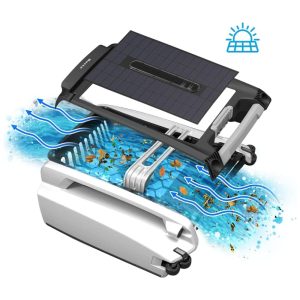 Utiliza 100 de energia solar para limpar automática e continuamente a superfície da água, removendo detritos como pêlos de animais, folhas, poeira, pólen e insetos mortos. Equipado com quatro hastes de proteção contra profundidade de água, ele usa radar ultrassônico para detectar obstáculos e se redirecionar para garantir que toda a piscina seja limpa.