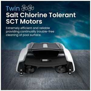 Equipado com motores duplos reprojetados com tolerância ao cloro salino SCT para acionar as hélices diretamente, tornando o mais confiável, ágil e eficiente em termos energéticos. Esta tecnologia inovadora garante um excelente desempenho de limpeza em piscinas de água doce e salgada.
