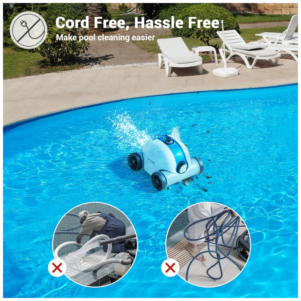 Limpador robótico conveniente para piscinas O limpador automático de piscina sem fio é o limpador robô de piscina mais inovador para piscinas subterrâneas, piscinas acima do solo de no máximo 100. Deixando de lado a restrição do cabo de alimentação, nosso robô limpador de piscina sem fio está equipado com bateria de íon de lítio de 5000mAh, que pode atingir até 60 90 minutos de trabalho, pode operar sem cabo conectado a uma tomada elétrica, permitindo maior mobilidade . Design à prova dágua IPX8 para bateria, tenha certeza de usá lo.
