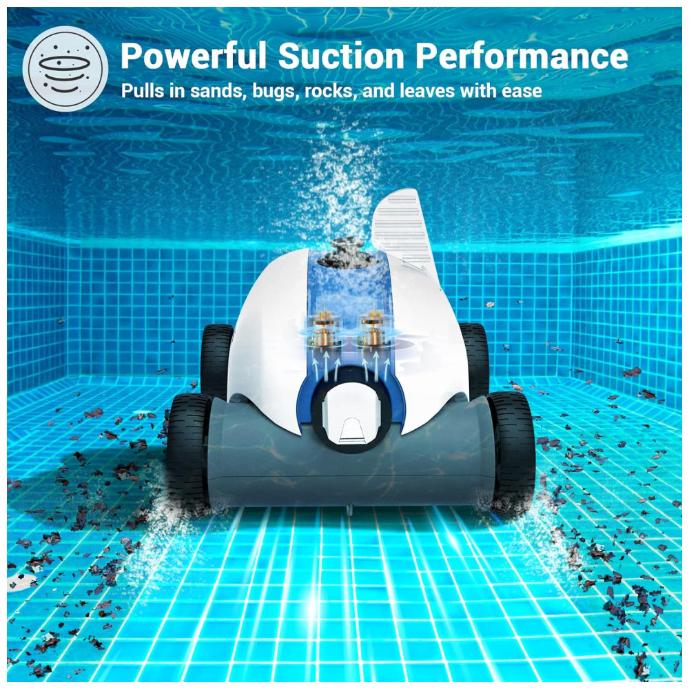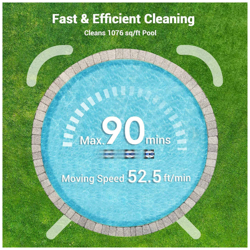 Super desempenho de limpezaCom defletor e motor potente, este limpador automático de piscina com velocidade de movimento rápido aproximadamente 16m, min e poderosa capacidade de limpeza, alta frequência, velocidade rápida, limpeza profunda, economizando tempo e esforço. Com duas grandes portas de sucção, uma escova inferior e um filtro superior, o limpador robótico de piscina pode prender e prender folhas, sujeira e areia, deixando a água da piscina limpa e brilhante. Nosso robô limpador de piscina assume suas tarefas de limpeza de piscina para sempre.