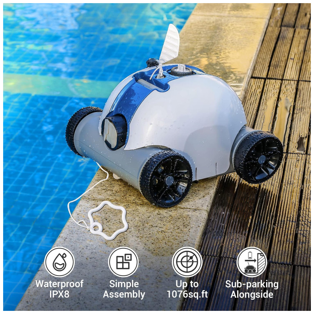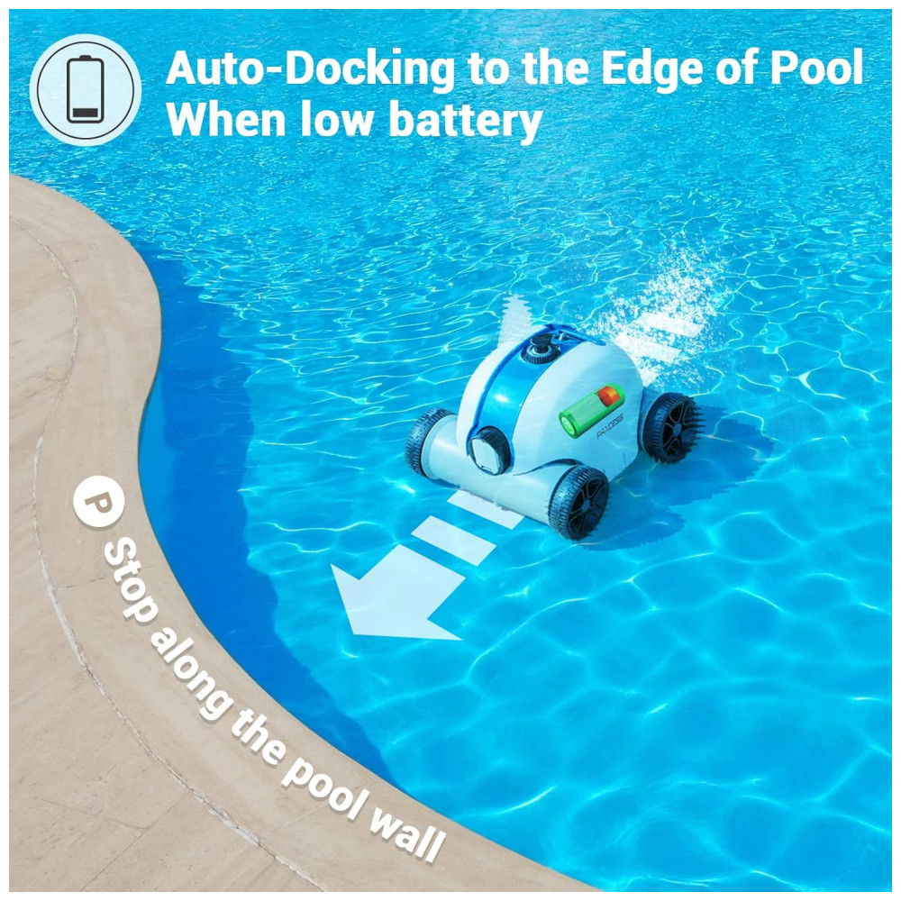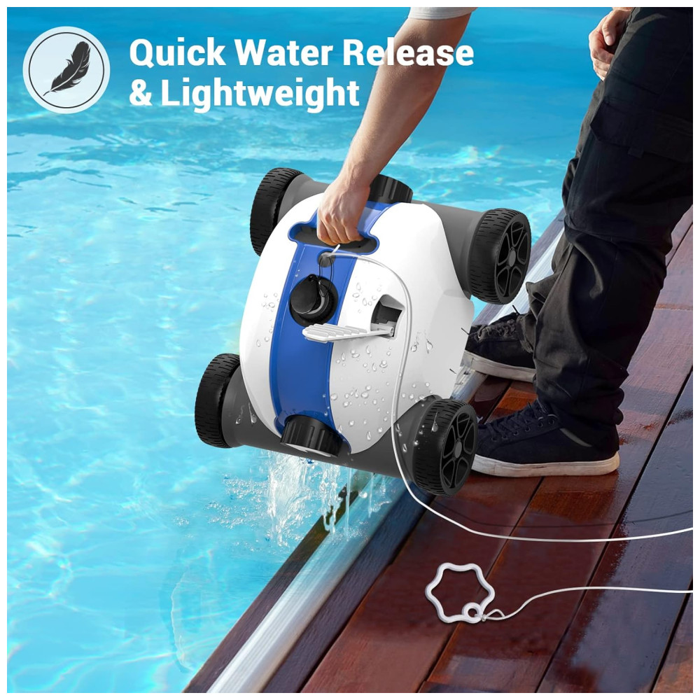 LEVE E FÁCIL DE LIMPAR Está equipado com uma alça flutuante que pode acompanhar o movimento do limpador robótico de piscina. Apenas 5,4 kg por isso é muito conveniente para idosos ou mulheres tirarem o limpador de piscina da piscina. O limpador de piscina sem fio pode subir em uma inclinação máxima de 15. O limpador robótico de piscinas é para todos os tipos de piscinas, como piscinas de concreto, fibra de vidro e vinil.