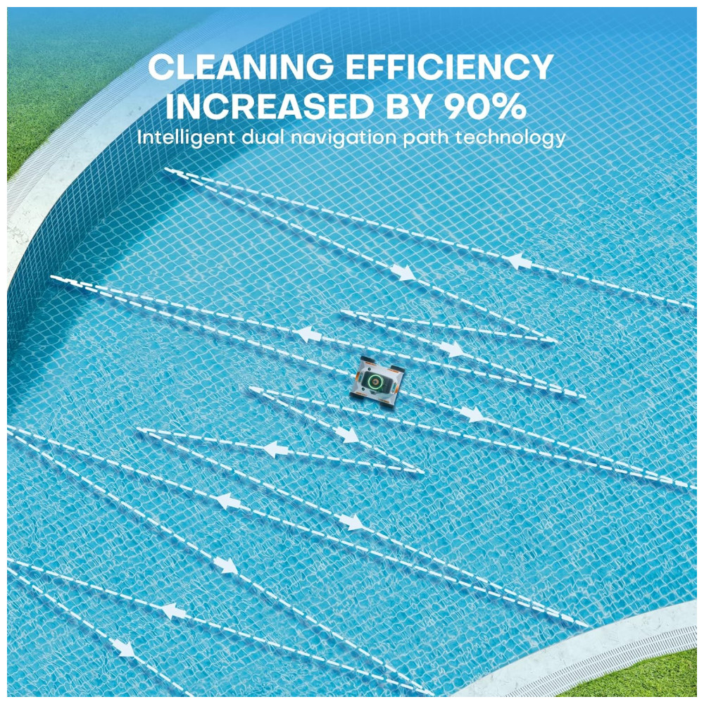 Caminho de navegação inovador Projetado de forma inteligente com sua tecnologia de caminho de navegação duplo, o aspirador de piscina sem fio reverte e retrocede na metade da piscina quando toca nas paredes da piscina. Assim, você tem a garantia de uma cobertura completa e eficiente da piscina. Retire as varreduras que faltam e transforme o piso completo da sua piscina em uma superfície limpa e brilhante