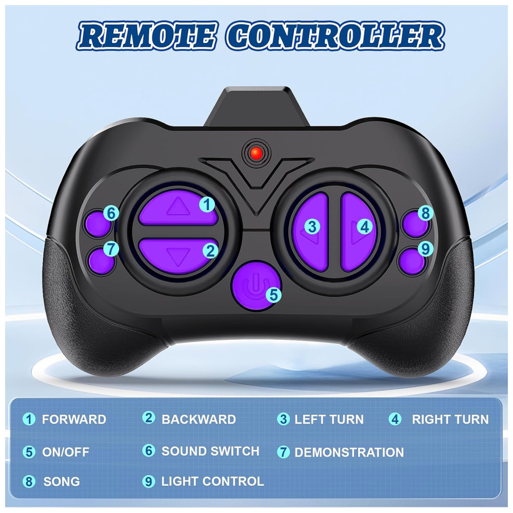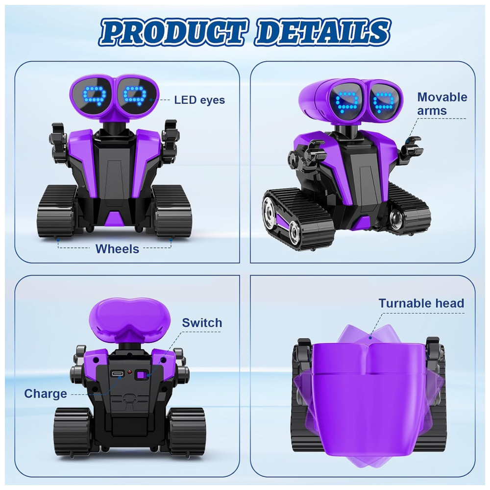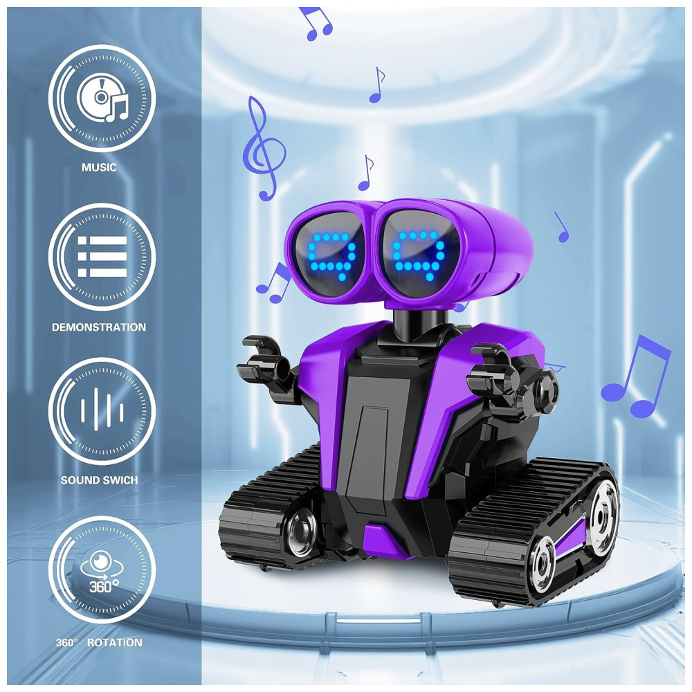 Multifuncional: O robô fofinho, com trilhos de tanque e 6 rodas, possui olhos LED ajustáveis que piscam ou permanecem acesos, controlados pelo controle remoto. Também conta com um alto-falante embutido com várias músicas para escolher.