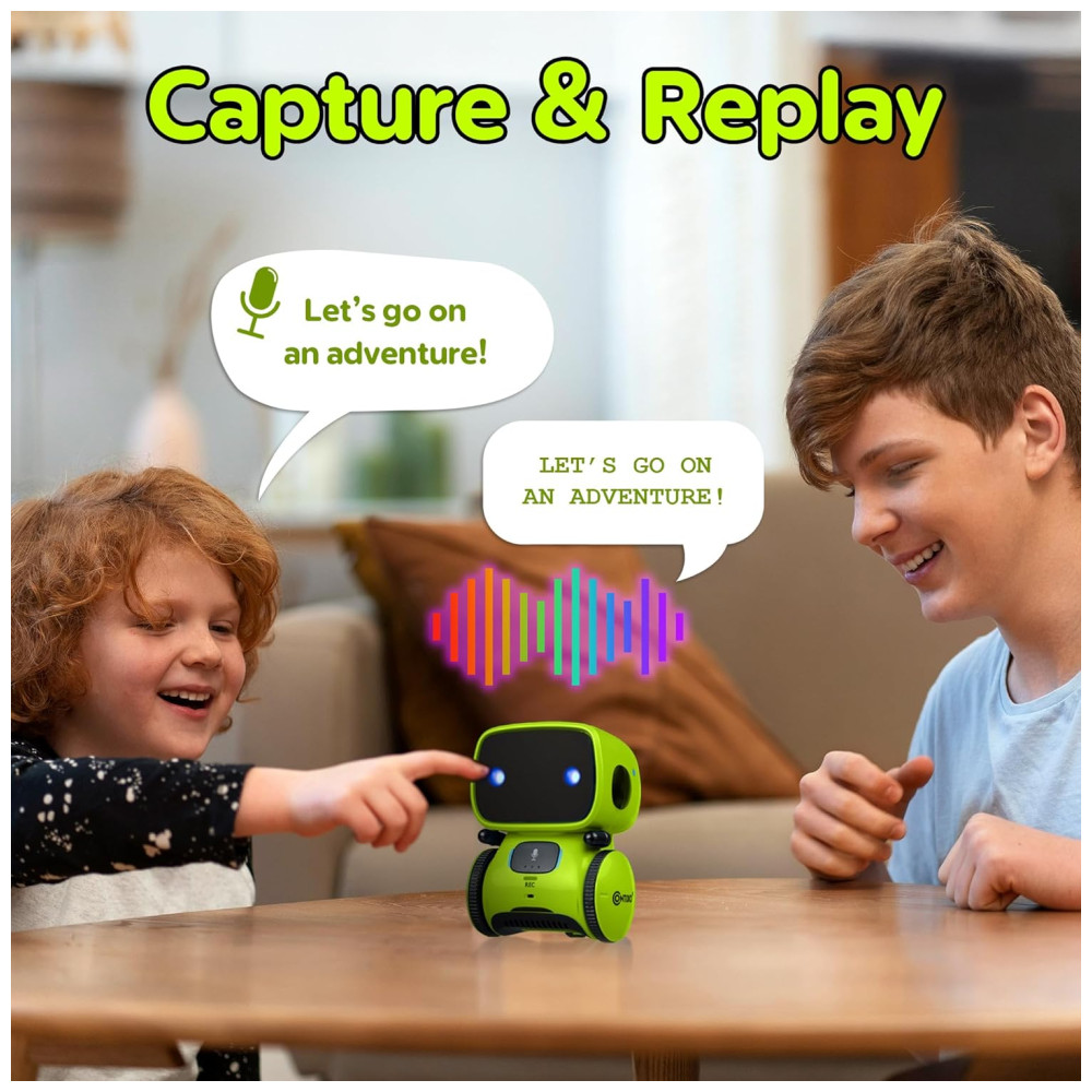 Controle de Voz e Indução por Toque, este brinquedo de robô pode responder ao toque para virar à esquerda, à direita, andar para frente e para trás. A função de Gravação de Voz permite gravar sua própria voz ou a de sua criança para reproduzir repetidamente.