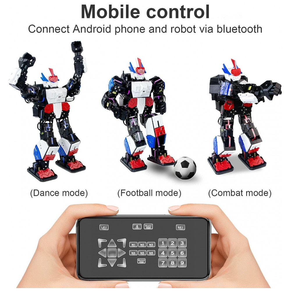 Kit Robô Avançado XR MRT Humanoid Robot é um robô humanóide multifuncional com 18DOF. Você pode controlá lo através do APP Android Bluetooth. Possui várias ações pré programadas, que podem realizar caminhadas básicas, lutas, futebol, dança e outras ações. É um robô totalmente autônomo.