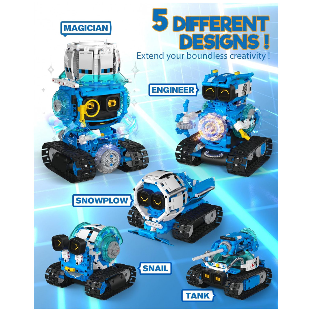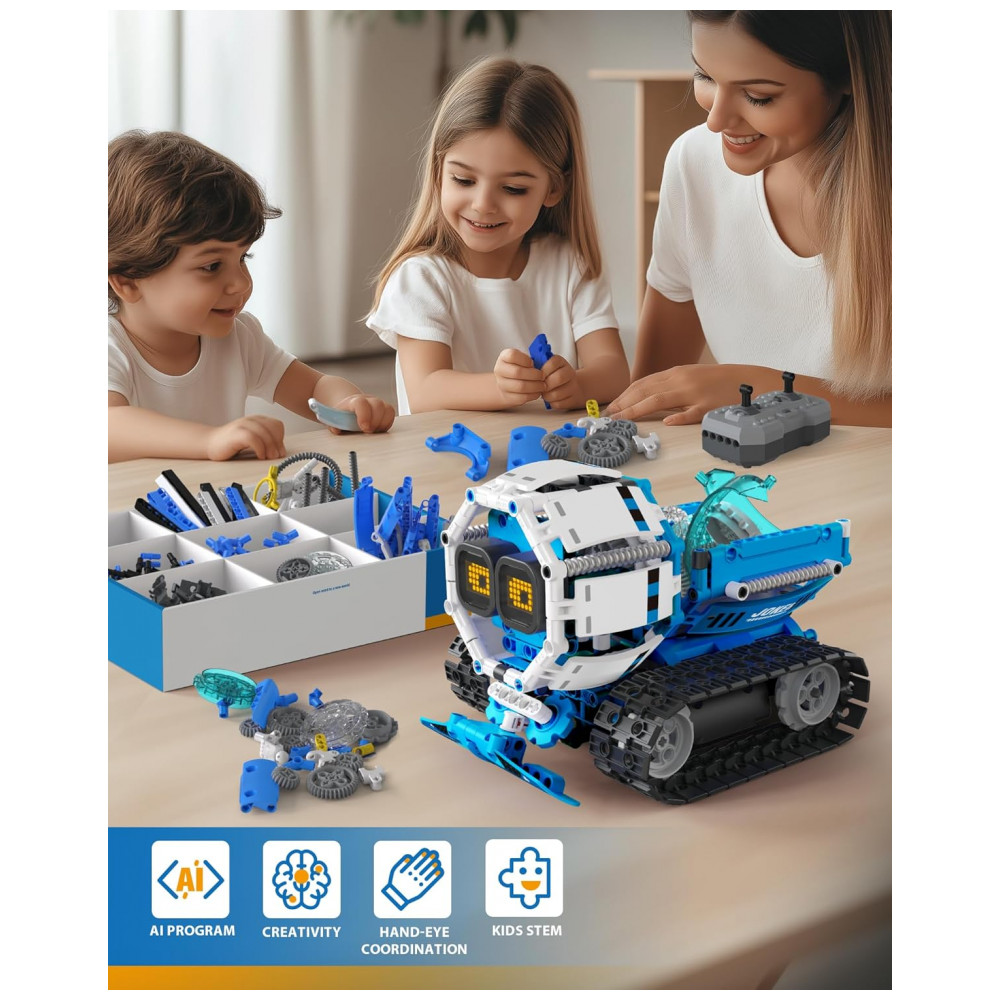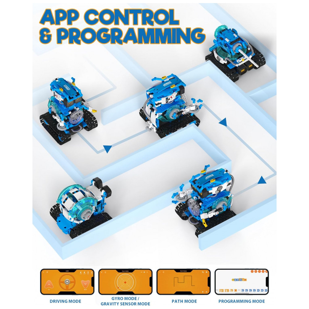 A unidade eletrônica pode ser configurada em cinco formas distintas utilizando o mesmo conjunto de peças, como robô tipo tanque sobre esteiras, veículo de serviço e modelos temáticos adicionais. O controle remoto de 2,4GHz permite avançar, recuar, girar e realizar manobras, enquanto o aplicativo oferece modos de direção, controle por giroscópio e programação por blocos. O sistema de esteiras foi projetado para deslocamento em pisos lisos e tapetes baixos, mantendo boa tração em diferentes superfícies internas.