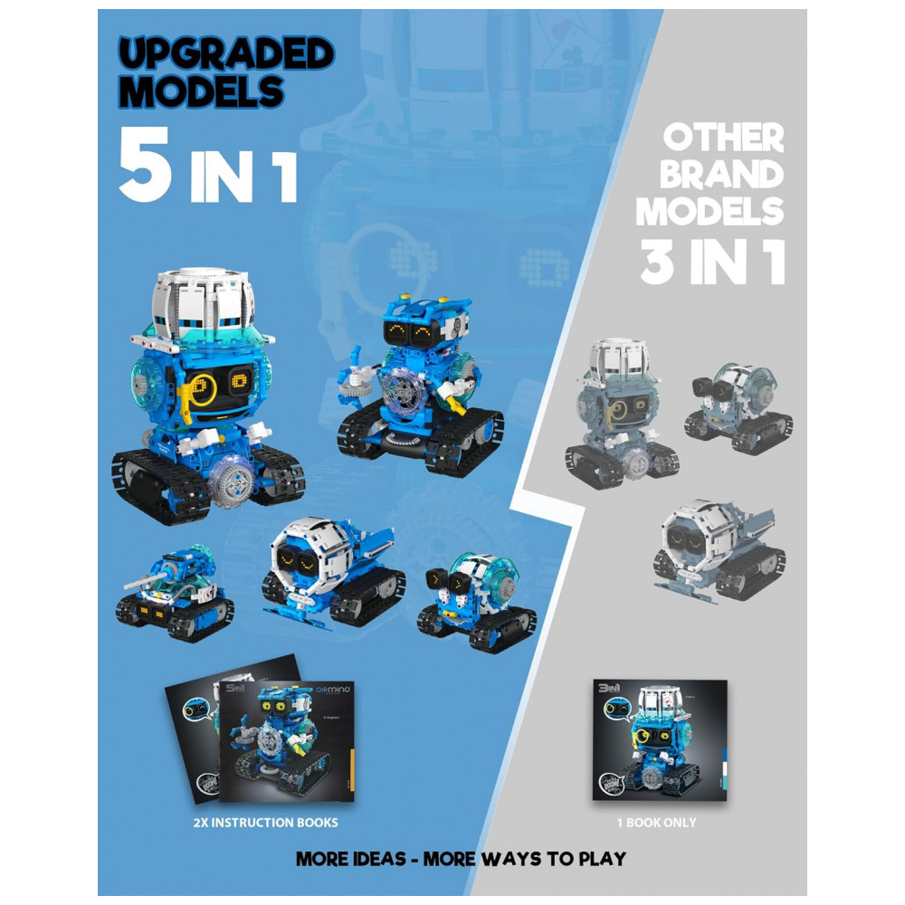 Robô STEM de montagem 5 em 1 Opmind controle remoto e app luz e som interativo 494 peças