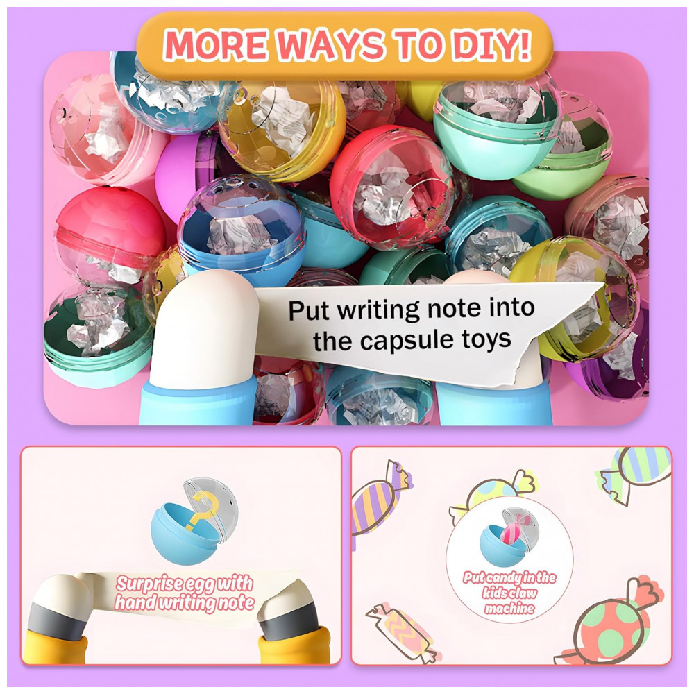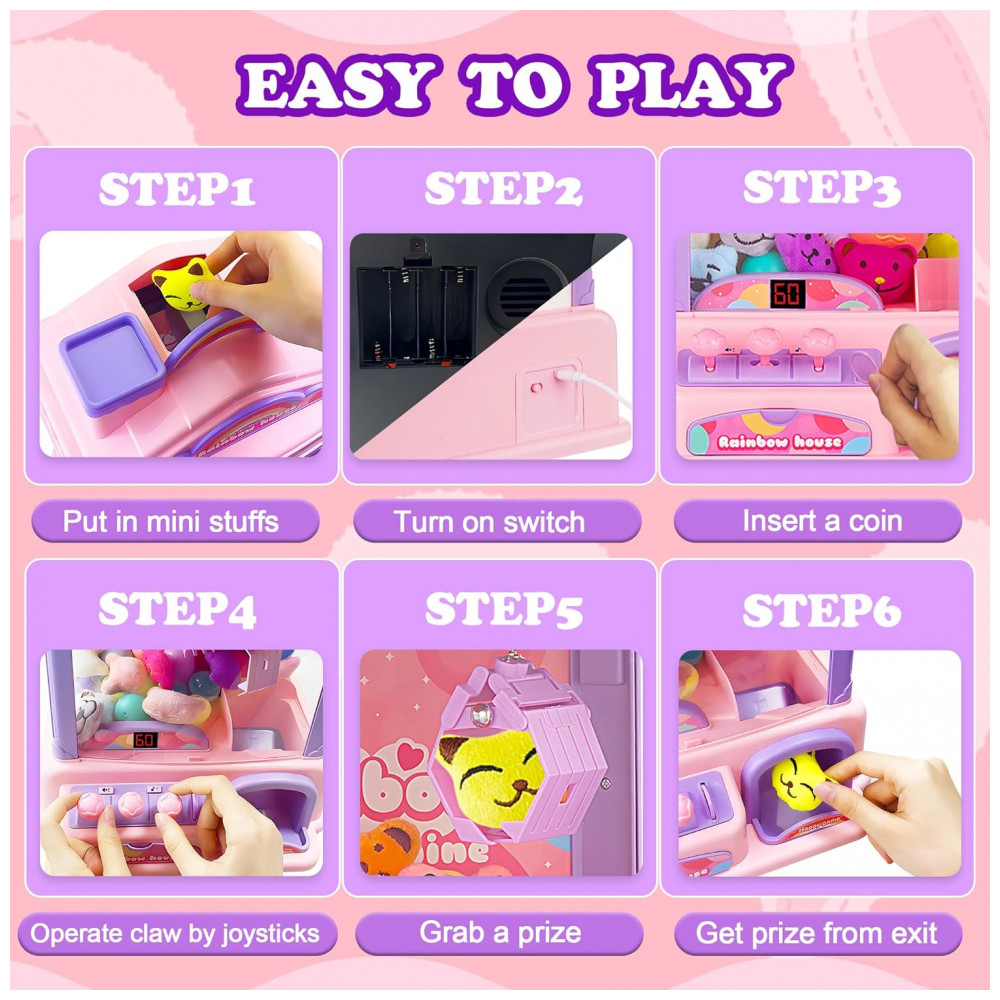 Inclui na Embalagem: 1 Mini Máquina de Garra, 24 bonequinhos de pano, 12 cápsulas com mini brinquedos, cabo USB