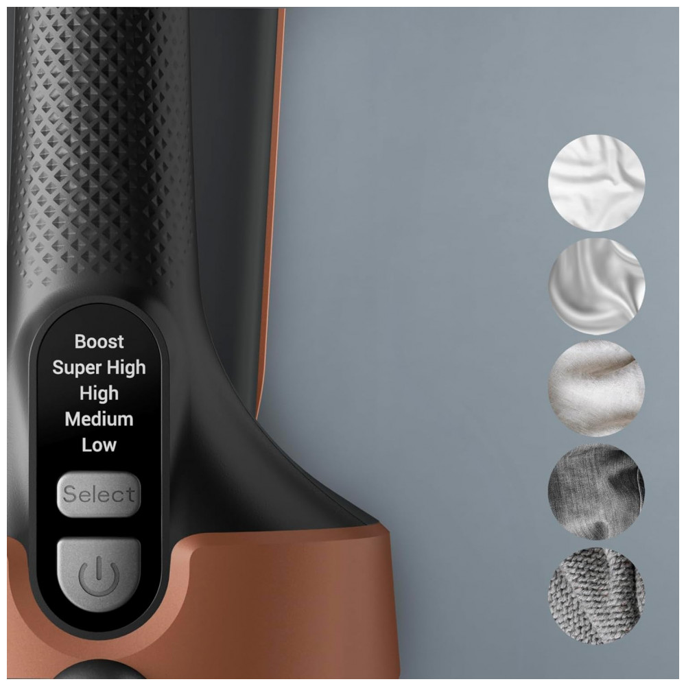 Este dispositivo de steamer para roupas oferece a combinação de vaporização vertical e passagem de ferro horizontal, proporcionando resultados excepcionais. Equipado com um tanque de 200ml, este ferro a vapor para roupas oferece até 12 minutos de cuidado contínuo e ininterrupto de tecidos, perfeito para lidar com qualquer peça de roupa. O avançado sistema de almofadas reversíveis remove poeira e fiapos com facilidade. Com 1875 watts de potência, o ferro a vapor puro se transforma em um prático limpador a vapor para roupas, oferecendo cinco configurações de vapor personalizáveis para atender a cada tipo de tecido. Economize tempo com a impressionante base XL, que fornece 300% a mais de vapor para passar com eficiência e precisão. Este steamer portátil é leve e possui um cabo de 2,6 metros para maior conveniência, garantindo que você possa manobrar com facilidade. Este steamer para roupas também possui função de desligamento automático. 3 EM 1 FUNCIONALIDADE Alterne perfeitamente ao usar o steamer portátil para passar roupas, vaporizar roupas e remover fiapos. EFICIÊNCIA DE POTÊNCIA EXTRA GRANDE Este ferro a vapor para roupas e steamer de roupas apresenta uma base XL 40% maior e 300% mais vapor. OPÇÕES DE VAPOR PERSONALIZADAS Ajuste as configurações deste steamer de tecidos para roupas ou steamer de roupas portátil. DESIGN LEVE E SEGURO Este steamer portátil para roupas é 24% mais leve que os steamers tradicionais, com a função de desligamento automático e um cabo de 2,6 metros. INOVAÇÃO DE VAPOR PURO Tenha 12 minutos de vapor com este steamer portátil para roupas; o tanque de 200ml oferece cuidado equilibrado para as peças de vestuário.