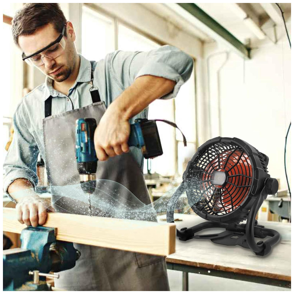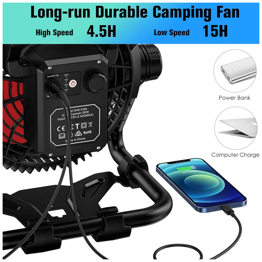 Portátil e de longa duração Porque o ventilador externo recarregável tem uma grande bateria de íon de lítio de 15600mAh, você pode transportar o ventilador e usá lo em qualquer lugar sem conectá lo. Ele pode funcionar por 4,5 a 15 horas com carga total, o suficiente para suportar o resfriamento de um dia. Além disso, com uma interface USB e tipo C, você pode carregar seu celular, laptop.