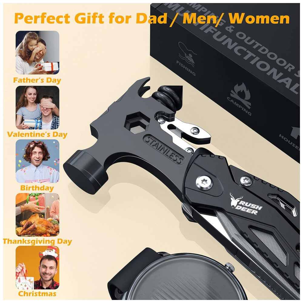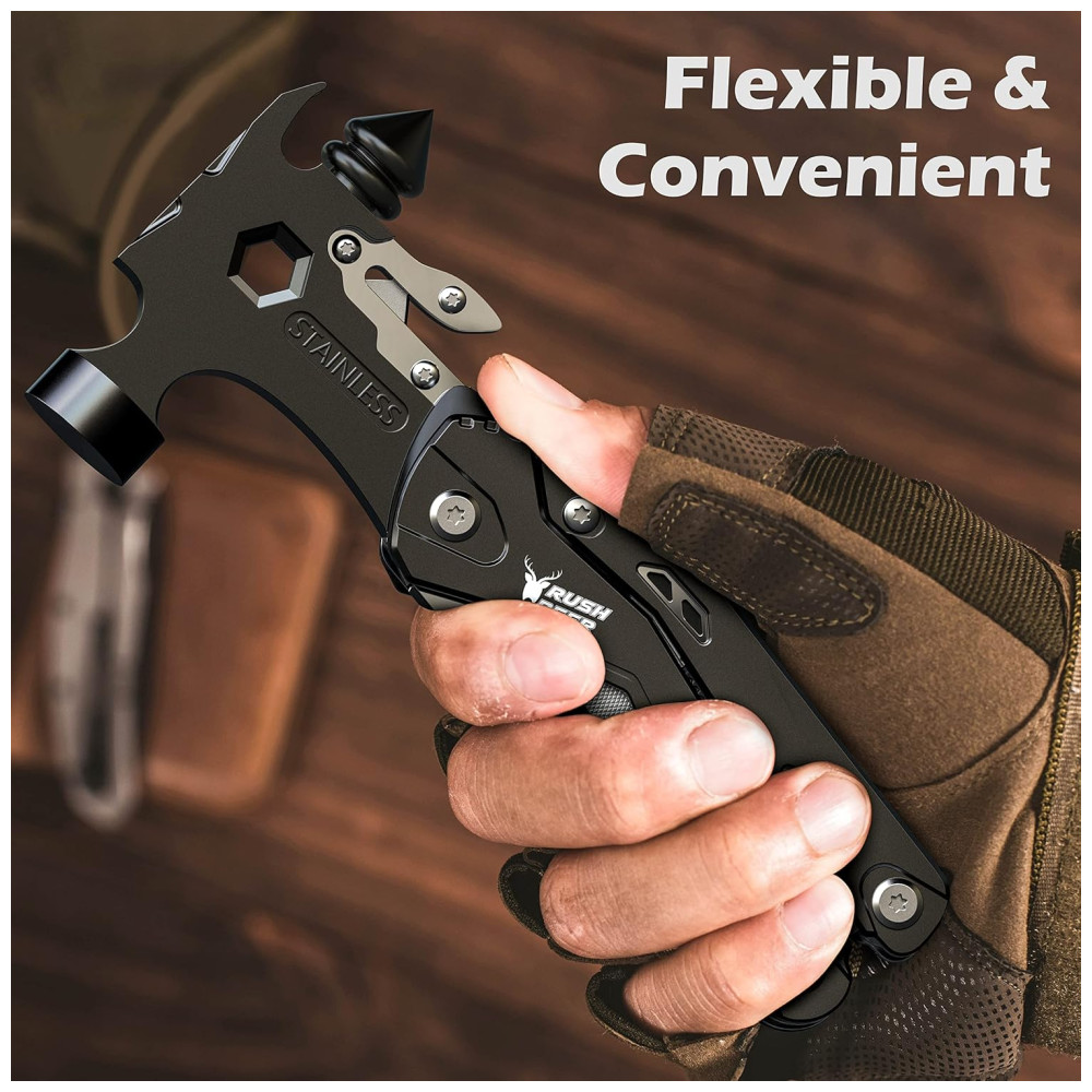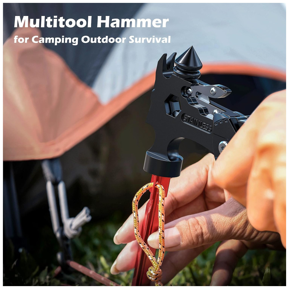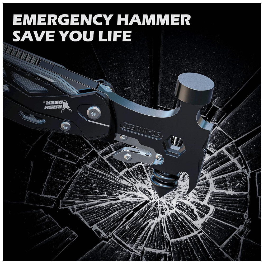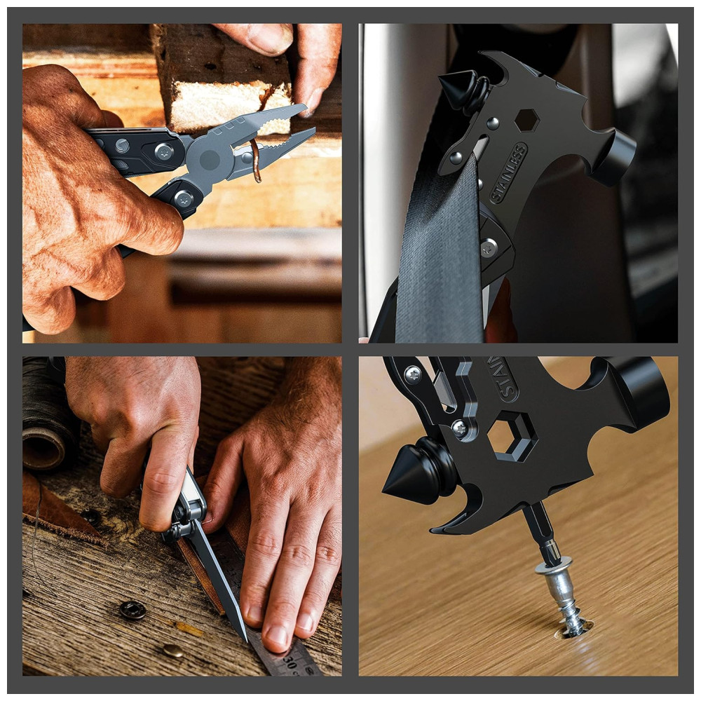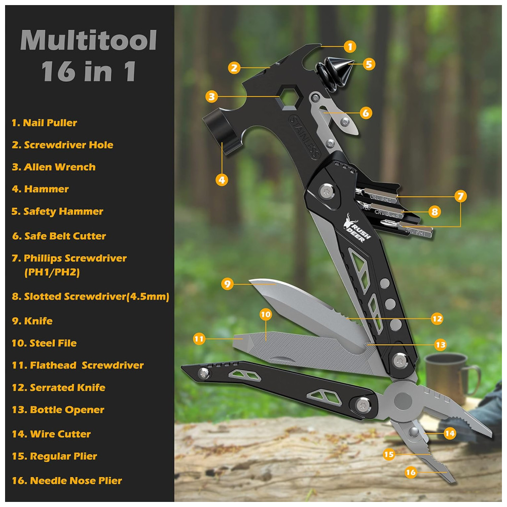 Kit de ferramentas tudo em um a multiferramenta de martelo 16 em 1 atualizada com sistema de travamento de segurança inclui orifício para chave de fenda, chave allen, minicom martelo resistente, puxador de unhas, martelo de segurança para carro, cortador de cinto de segurança, chave de fenda, lima de aço, faca, phillips chave de fenda PH1 , PH2, chave de fenda 4,, abridor de garrafas, faca serrilhada, alicate comum, alicate de corte, alicate de bico fino. Tudo o que os homens e mulheres precisam para trabalhar em projetos de reforma, carpintaria e DIY. Uma necessidade para toda família