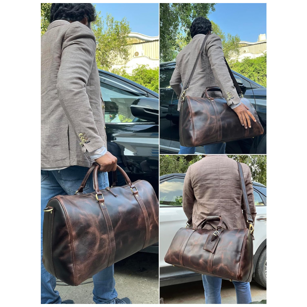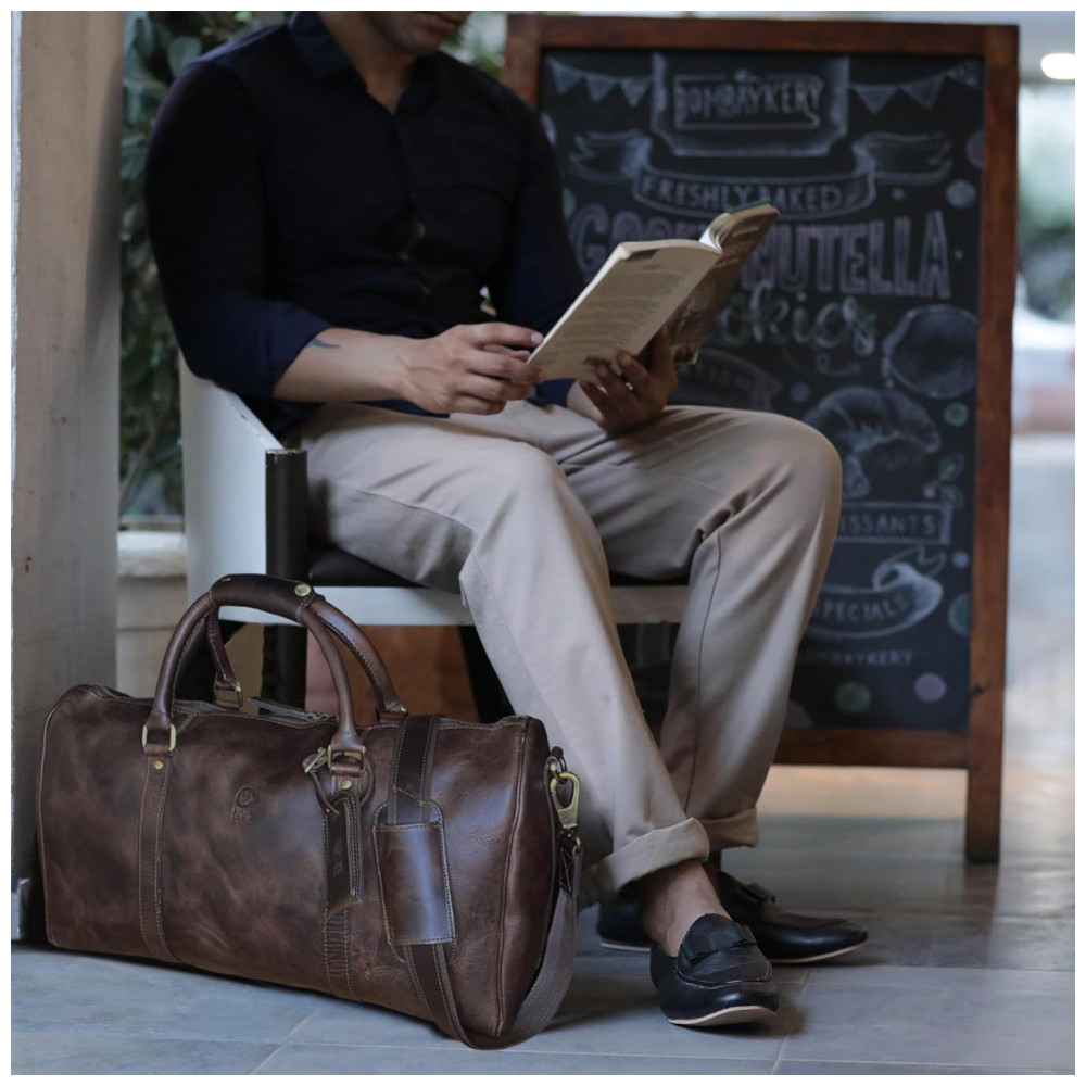 COURO VERDADEIRO DE QUALIDADE Procurando por bolsas duffle resistentes e resistentes Couro verdadeiro é obrigatório. Feito à mão por artesãos indianos, nossa bolsa é feita de couro de búfalo que pode suportar todas as suas aventuras.
