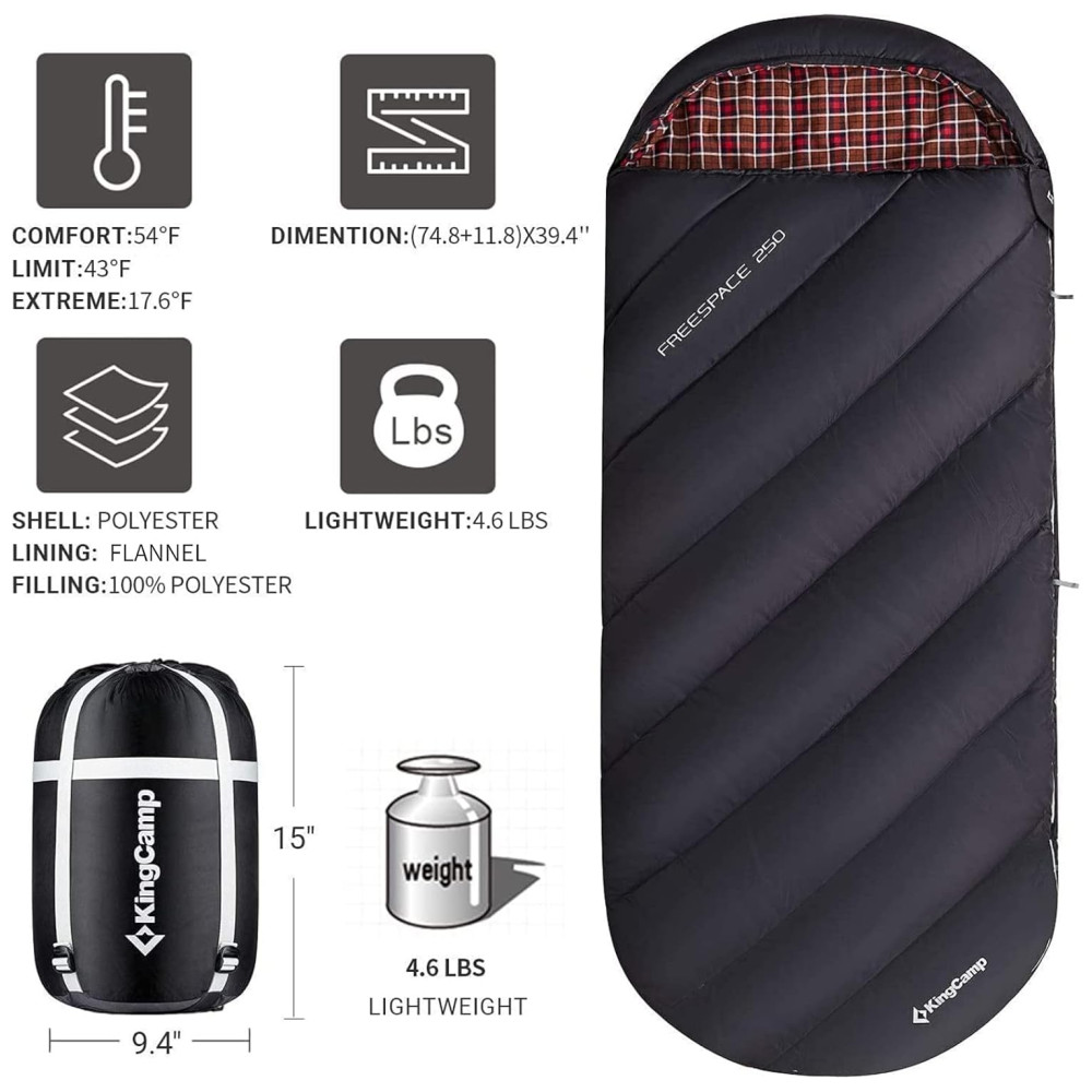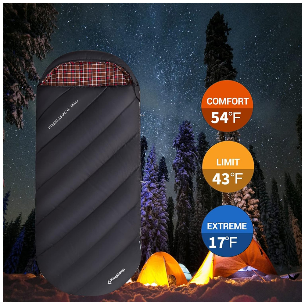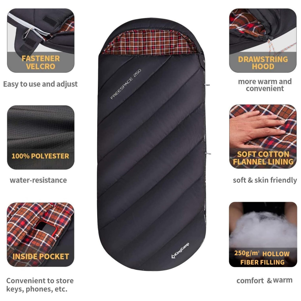 Quente e aconchegante Os sacos de dormir KingCamp para adultos com enchimento de fibra oca de 250g, e forro de flanela 100 algodão oferecem excelente calor e conforto durante toda a noite. Nosso saco de dormir de acampamento adota um design de acolchoado diagonal, que pode fixar melhor o algodão, bloquear a temperatura de cada centímetro do saco de dormir quente para aumentar o calor do fundo. É muito adequado para atividades ao ar livre no outono, verão, primavera.