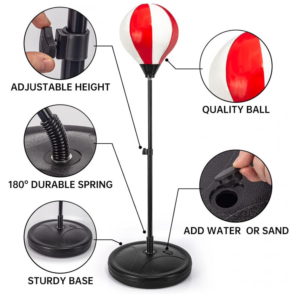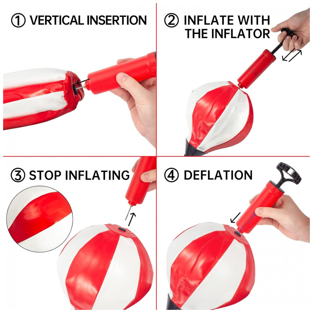 Itens inclusos na embalagem: 1 bola de boxe inflável, 2 pares de luvas infantis, 1 base, 1 haste ajustável, 1 bomba de ar, acessórios de montagem
