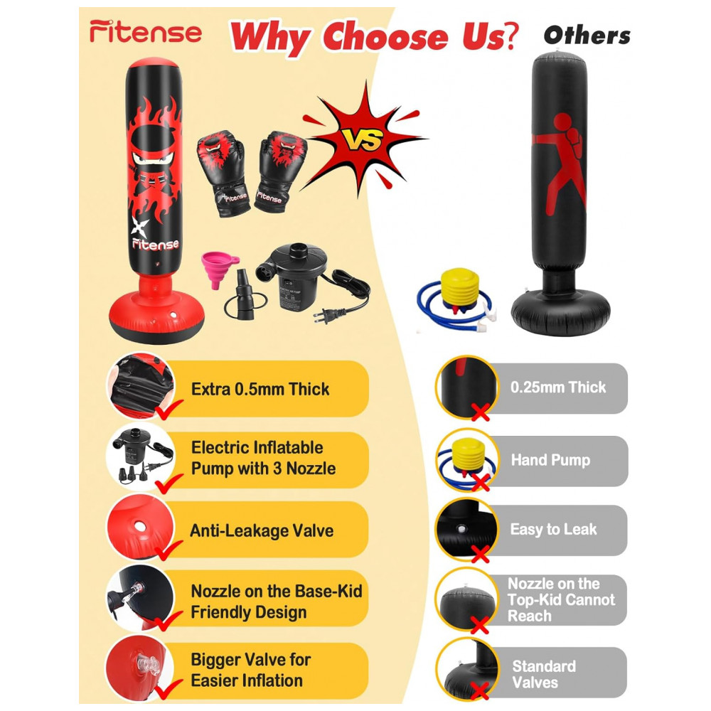 O produto é indicado para uso em ambientes internos e externos planos, contribuindo para rotina de atividade física lúdica e prática inicial de golpes de boxe e karatê, sempre com supervisão de adultos. A estrutura inflável permite esvaziar e guardar o saco de pancadas quando não estiver em uso.
