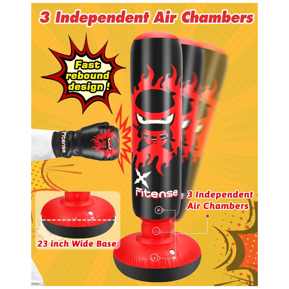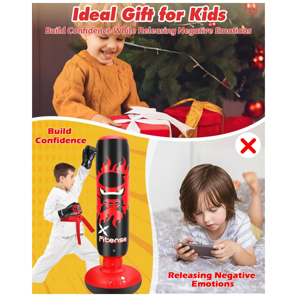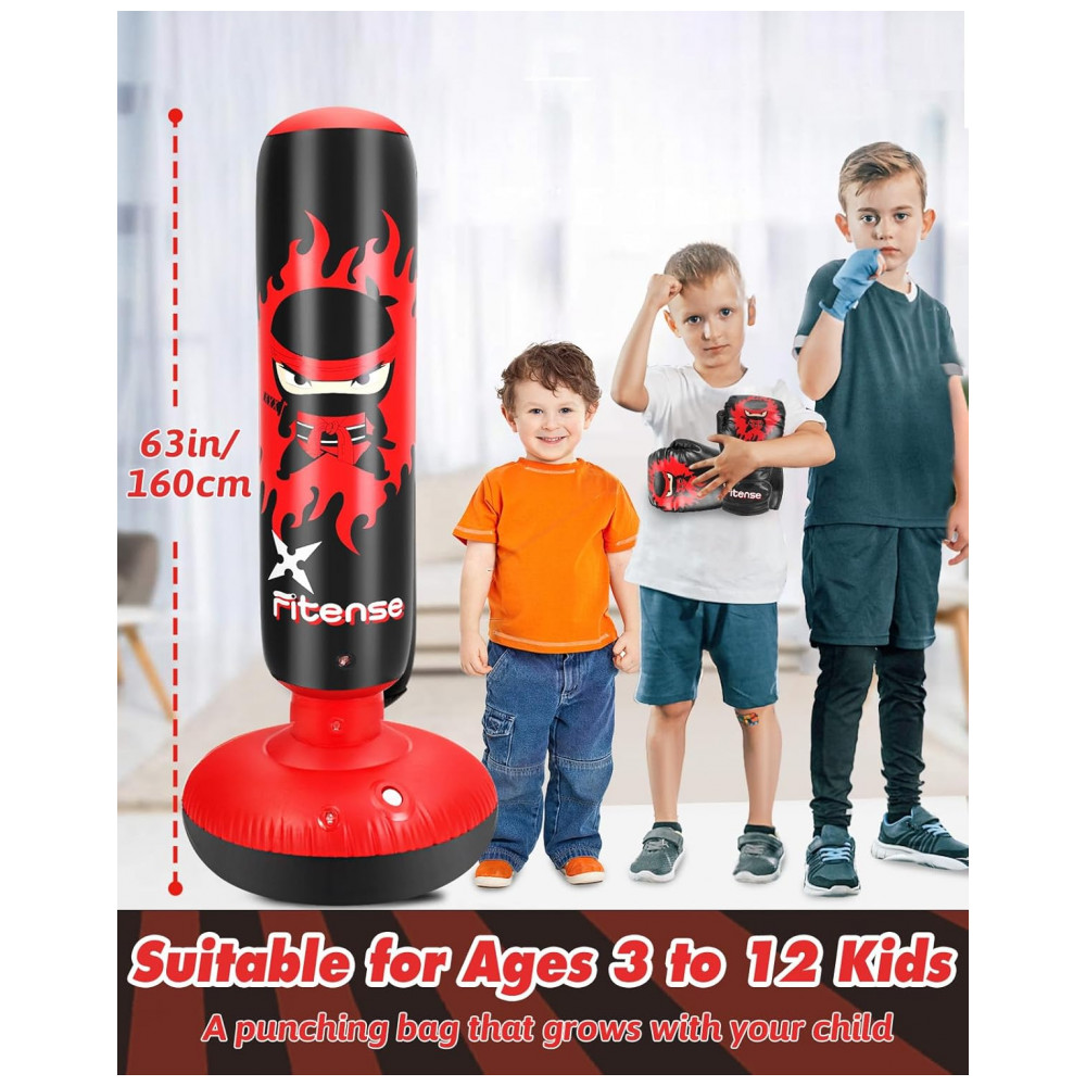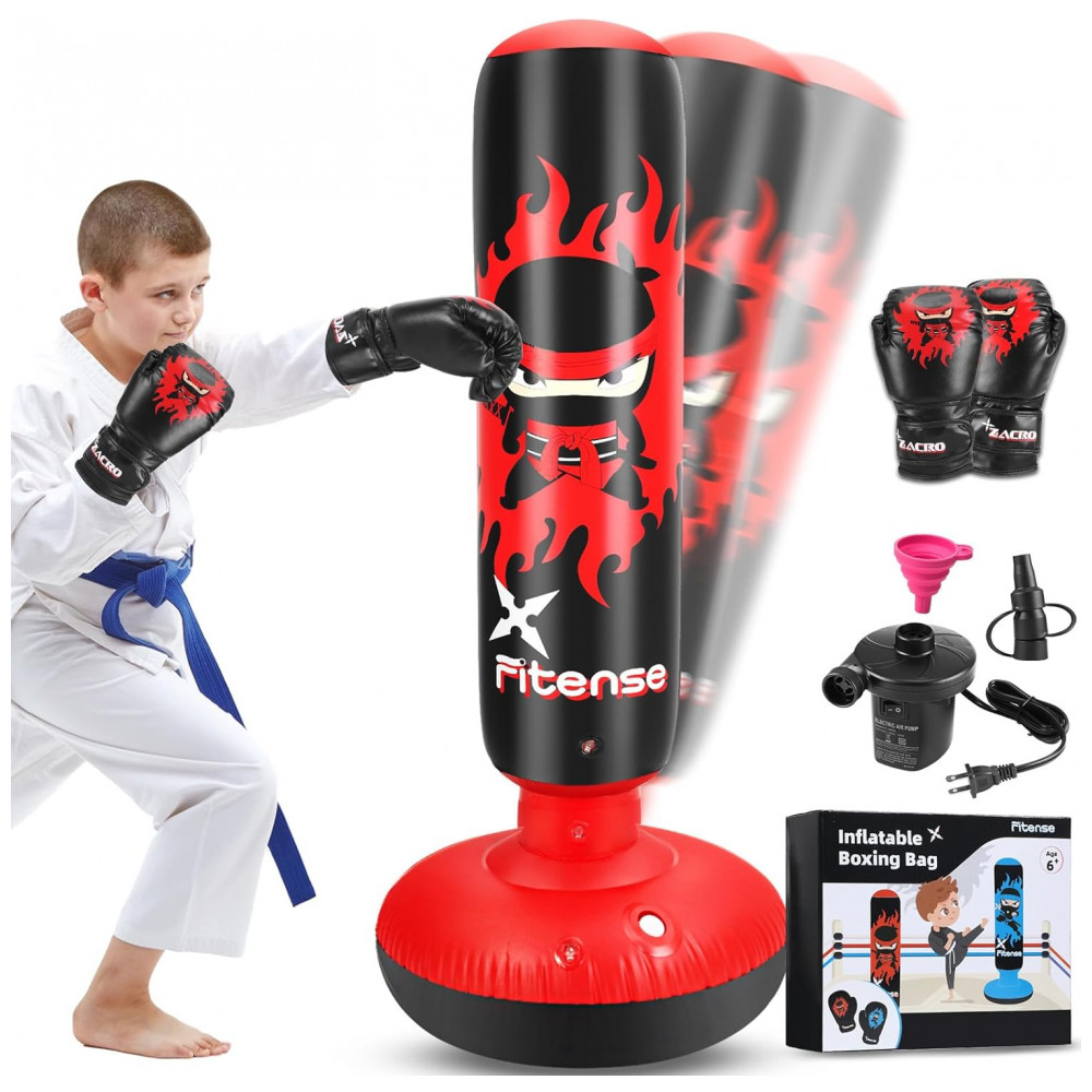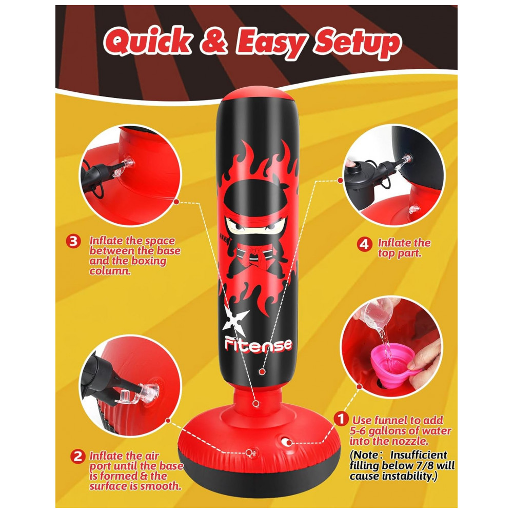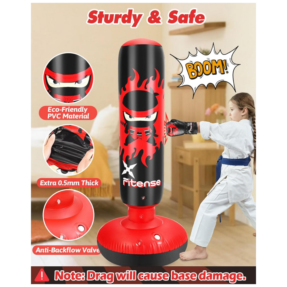 Saco de pancadas inflável infantil Fitense, com tema Red Ninja, indicado para boxe recreativo e artes marciais leves para crianças de aproximadamente 6 a 12 anos. Fabricado em PVC com espessura reforçada de 0,5 mm e superfície lisa, foi projetado para uso frequente, com estrutura que auxilia a reduzir vazamentos de ar e água na base.