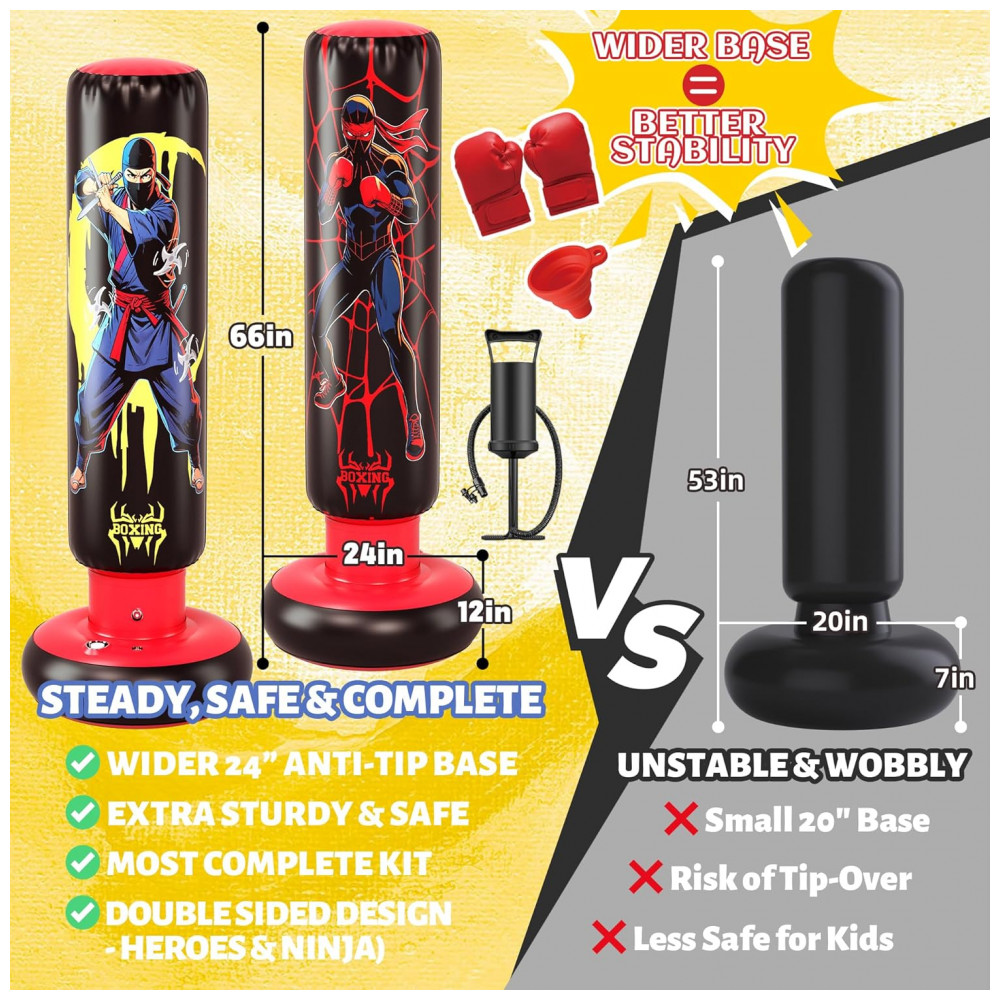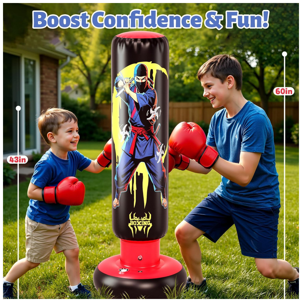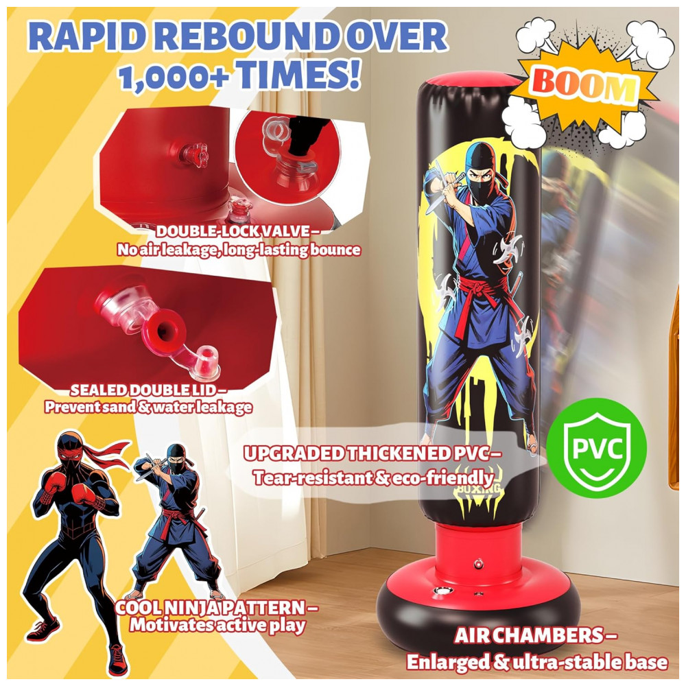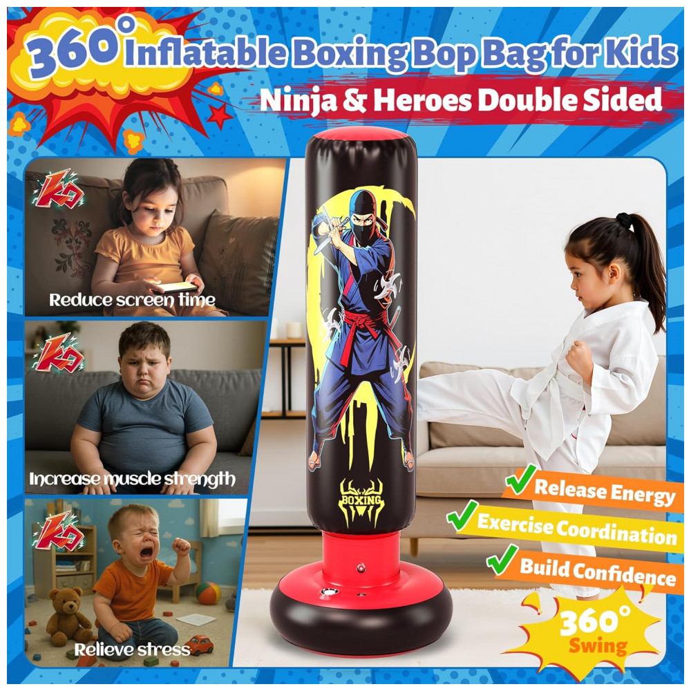 Saco de pancadas inflável infantil JOY SPOT! com 168 cm de altura, desenvolvido para boxe e artes marciais recreativas por crianças na faixa etária infantil. O modelo possui estampa dupla face com tema ninja e herói, estimulando o uso em brincadeiras ativas e treinos leves em casa.