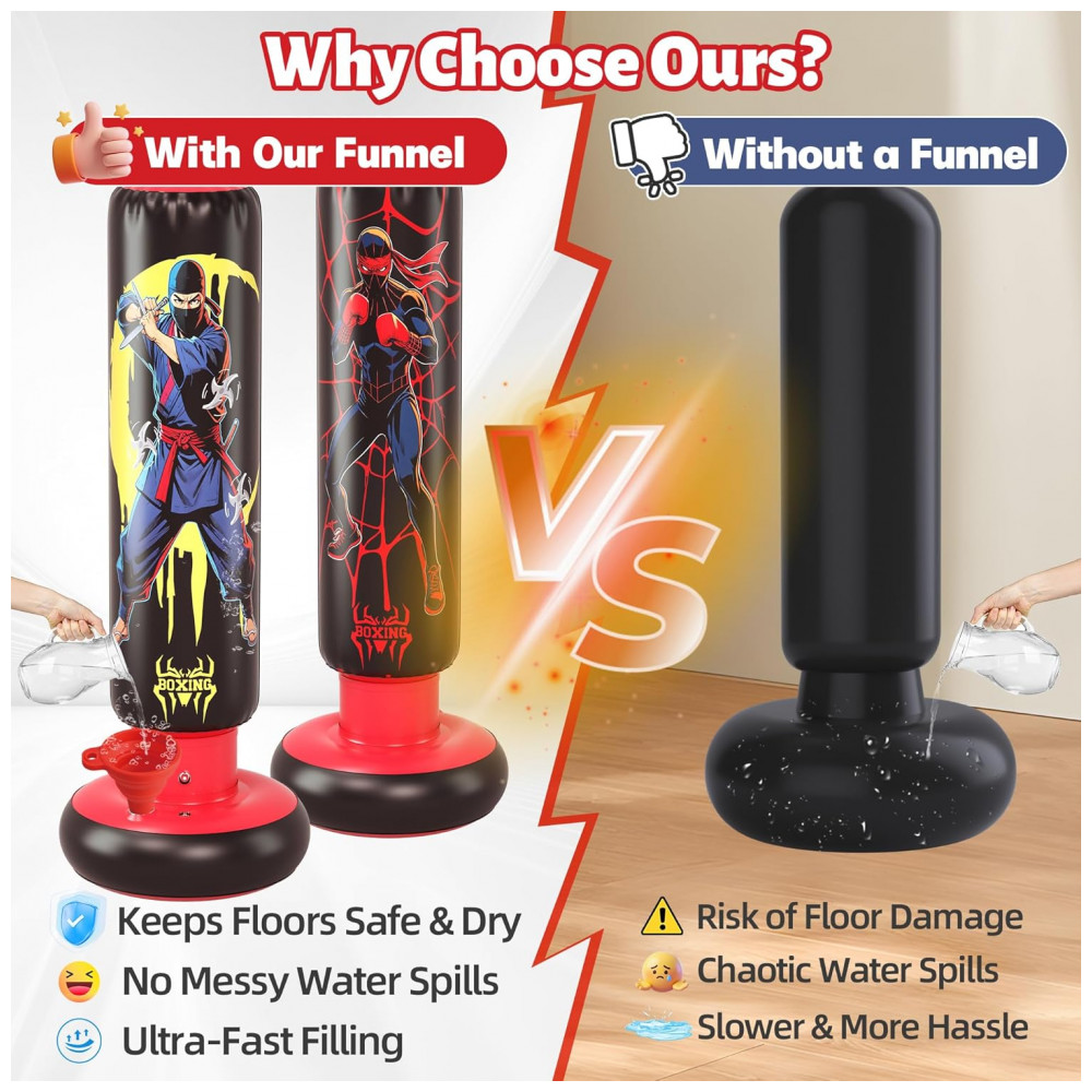 A estrutura é produzida em PVC com espessura de 0,5 mm, com base larga para enchimento com água ou areia, proporcionando estabilidade durante socos e chutes. O conjunto acompanha luvas, bomba de ar e funil para abastecimento de água, facilitando a instalação em ambientes internos ou externos planos.